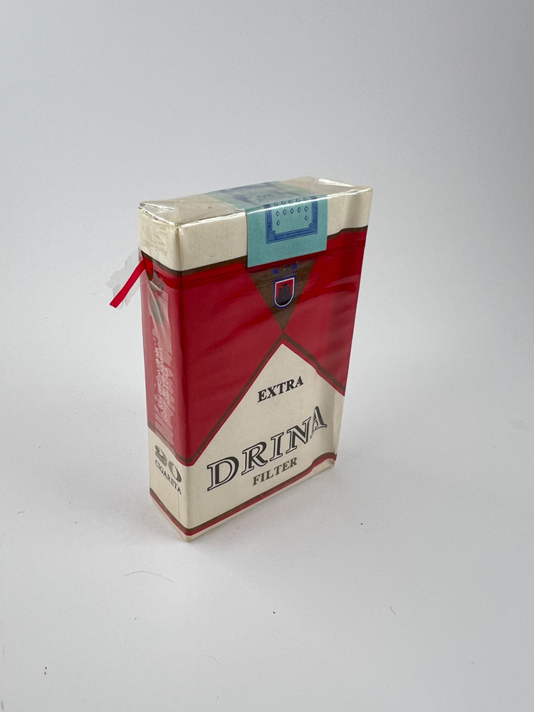 Description: This pack of Drina Extra Filter cigarettes is a classic soft type, with a red and white design and a brand name printed in two languages – Latin and Cyrillic – reflecting the bilingual market in the then Yugoslavia. A shield with a coat of arms is visible in the center, and the original old excise sticker is on top. The quantity indicated on the side is 20 cigarettes. The design is minimalist, in keeping with the aesthetics of Balkan packaging of that period. The pack is completely unpacked and has a pull-out opening strip.
