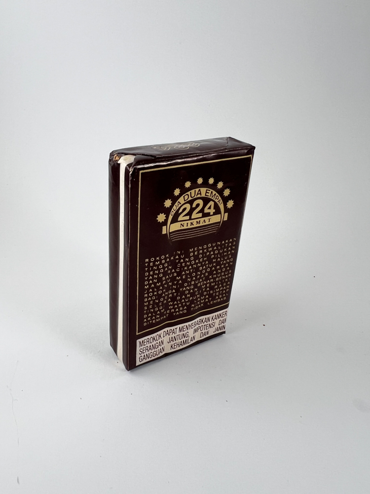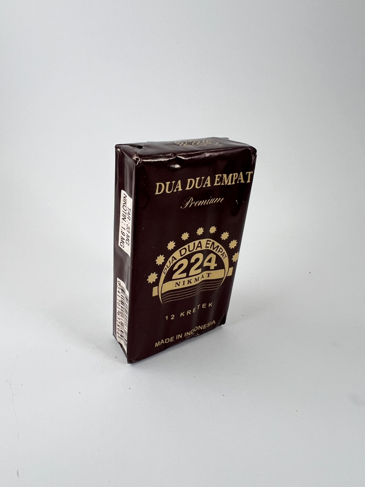 Aprašymas: Šis „Dua Dua Empat 224 Nikmat Premium“ cigarečių pakelis yra tamsiai rudos spalvos su auksiniais užrašais, kurie suteikia jam prabangos įspūdį. Priekinėje pusėje dominuoja ženklas „224 Nikmat“, o viršuje nurodytas pavadinimas „Dua Dua Empat Premium“. Nugarėlėje pateikiamas išsamus aprašymas indonezų kalba apie gaminio sudėtį ir kokybę. Ant pakelio yra aiškiai matomas sveikatos įspėjimas. Šis pakelis yra neišpakuotas, su išlikusia originalia plėvele.