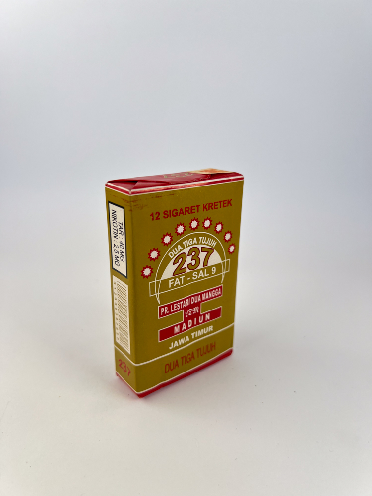 „"Dua Tiga Tujuh" (translated as "two two three seven") is one of the classic regional kretek brands from Madiun city, East Java province. The packaging design features a warm gold background with red accents, a combination that is visually associated with traditional Indonesian tobacco products. Logo with number 237 and I write FAT – SAL 9 refers to a specific production code or line. The back part contains a red background with the manufacturer's description of the high-quality tobacco and clove blend, emphasizing the exceptional richness of the flavor.