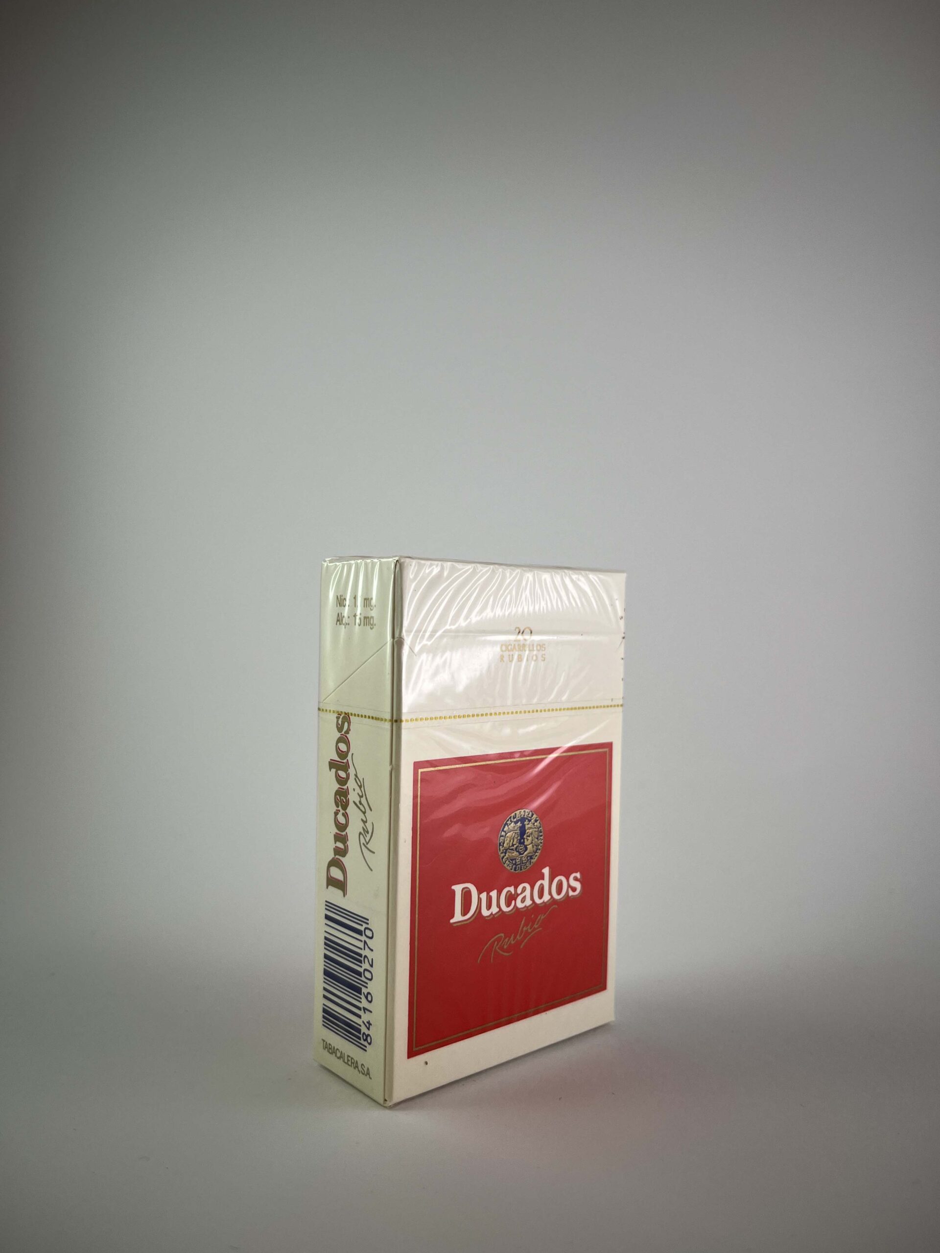 Description: The Ducados Rubio cigarette pack has a simple and elegant design. The main element is the combination of red and white colors with gold accents, giving the pack a luxurious look. The Ducados brand name is clearly visible, and the Rubio inscription emphasizes the light tobacco blend. This design perfectly reflects the traditions and quality of the Ducados brand. The health warnings are in Spanish, confirming the pack’s purpose for the Spanish market.