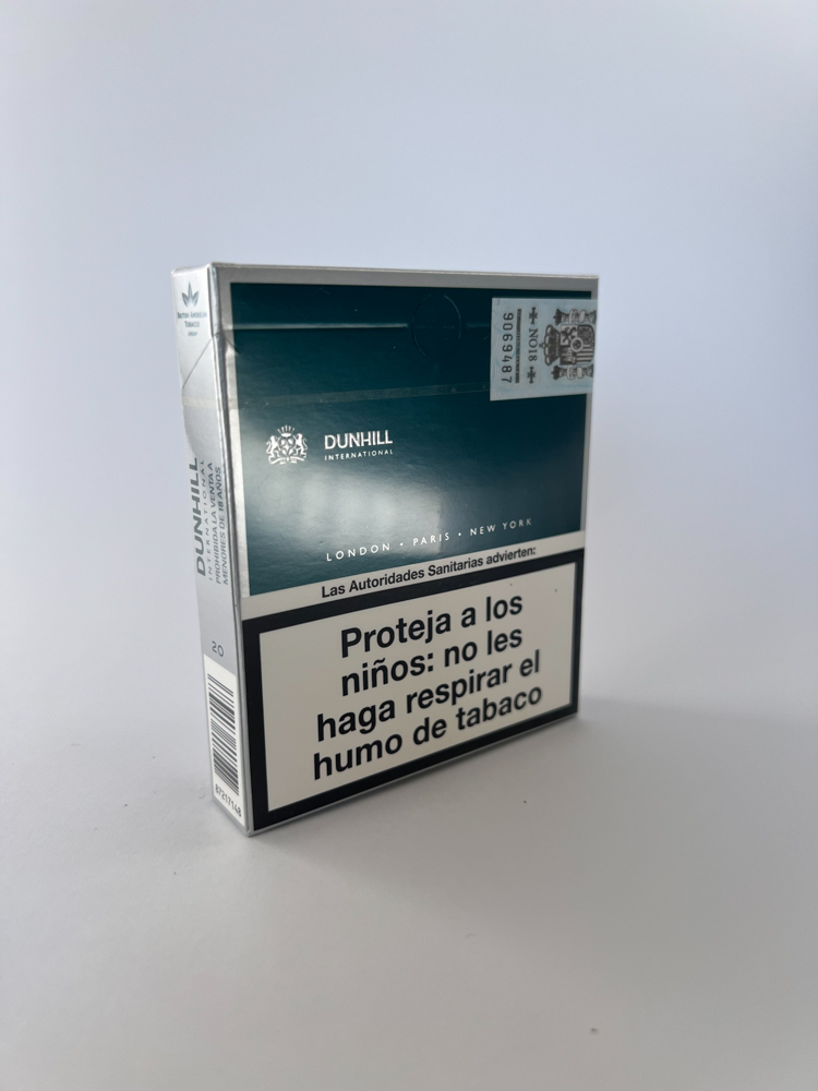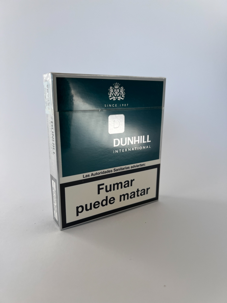 Dunhill International – tai prestižinis britų kilmės cigarečių ženklas, garsėjantis aukštesnės klasės dizainu ir kokybe. Šis konkretus pakelis išsiskiria elegantišku tamsiai mėlynu atspalviu su minimalistiniu ženklinimu ir „D“ simboliu. Viršutinėje dalyje paminėta įkūrimo data – 1907 m., o pakelio gale nurodytos trys prestižinės pasaulio sostinės – Londonas, Paryžius, Niujorkas – pabrėžiant tarptautiškumą. Įspėjimai apie rūkymo žalą pateikti ispanų kalba: „"Smoking can kill"“, „Proteja a los niños…“, o tai rodo, kad pakelis buvo skirtas Ispanijos ar Lotynų Amerikos rinkai.