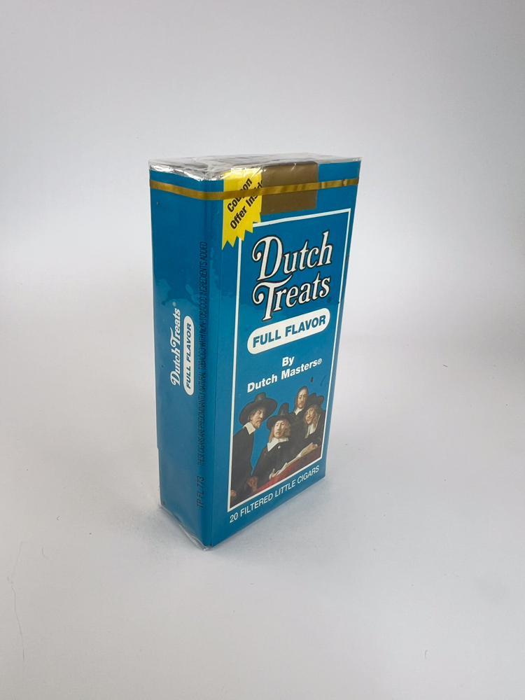 Historical data and popularity: „Dutch Masters is one of the oldest and most well-known cigar brands in the United States, having been around since 1911. This sub-brand, Dutch Treats, was created as a cheaper, everyday version of the little cigars, while maintaining the basic visual identity. These packs are prized by collectors for their condition and preserved promotional element (coupon offer).