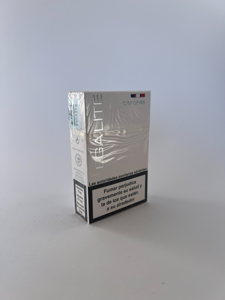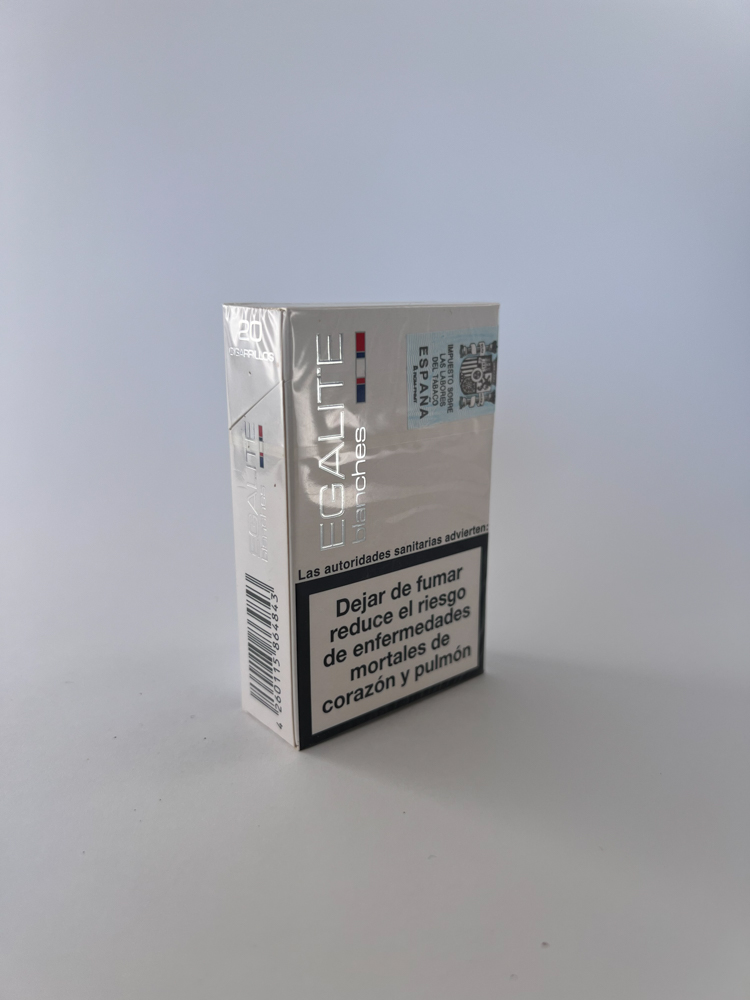 Égalité Blanches is a modern-looking cigarette pack, distinguished by its light (almost white) design and silver logo. The name „Égalité“ (French for „equality“) and the colors of the French flag were probably used for marketing purposes to create a European, sophisticated image. The pack is aimed at the Spanish-speaking market – health warnings in Spanish are printed on both sides („Fumar perjudicada gravemente su salud y la de los que están a su alrededor“ and „Dejar de fumar reduce el riesgo de enfermedades mortales de corazón y pulmón“). On the top is a Spanish excise stamp.