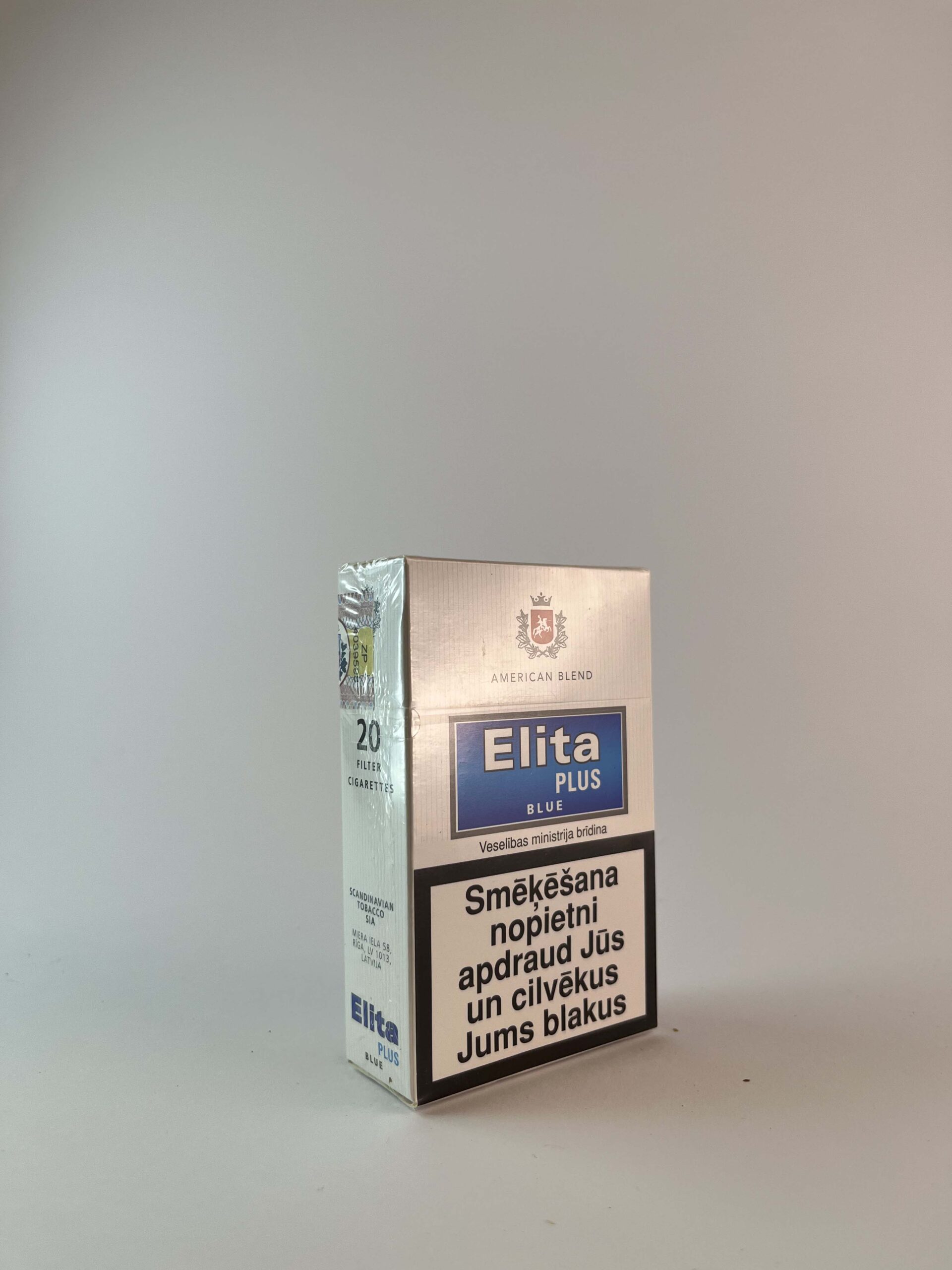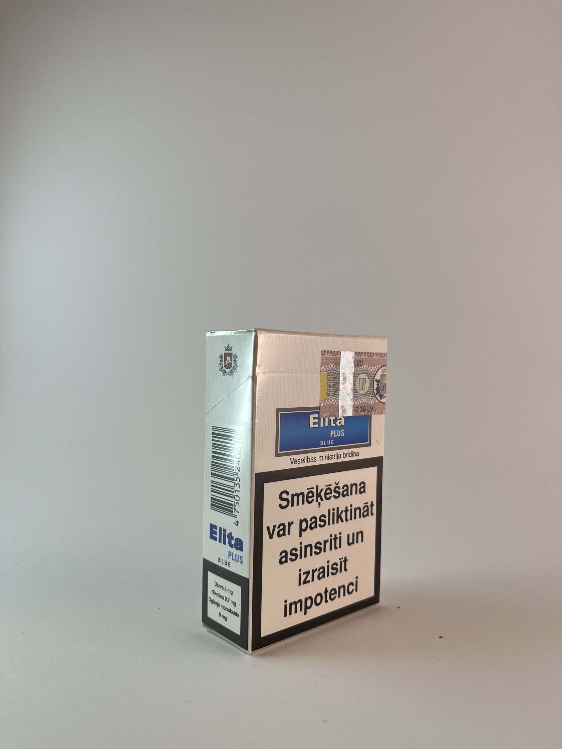 Description: The Elita Plus Blue cigarette pack is light silver in color with a blue logo and warning labels in Latvian. On the front of the pack there are warnings from the Ministry of Health about the harm of smoking, such as "Smoking can worsen blood circulation and cause impotence" and "Smoking seriously endangers you and people around you". The design is simple and meets modern standards, with the coat of arms of the Republic of Latvia and an excise stamp.