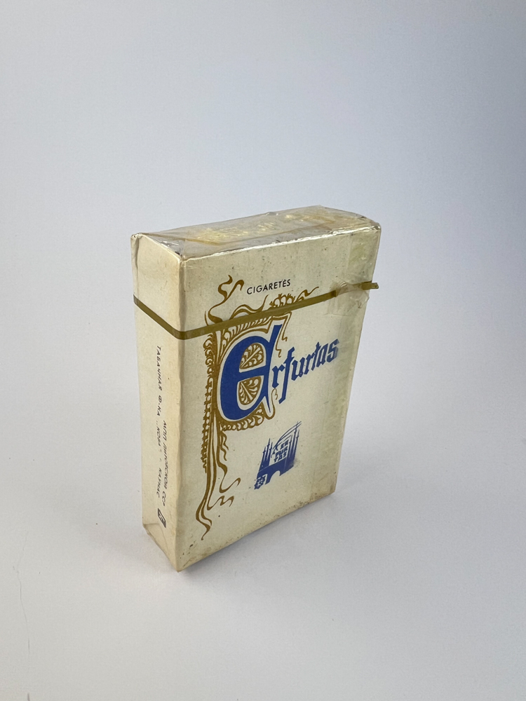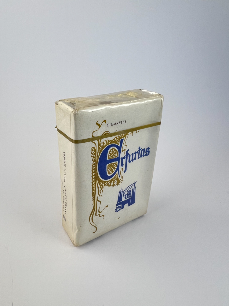 Description: This Lithuanian Soviet-era cigarette pack "Erfurtas" stands out with its white background and artistically decorated name. The word "Erfurtas" is written in Gothic font, the initial letter E is uniquely decorated with golden curves. Below it is a stylized blue silhouette of the city of Erfurt - a German city with which cultural or economic ties were likely maintained. At the top of the pack is the inscription "CIGARETTES", indicating production for the local market. Visually, the pack conveys European elegance and the influence of diplomatic ties of the era.