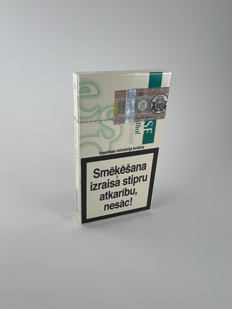 The ESSE Menthol cigarette pack from the Latvian market features an elegant and clean design – dominated by light tones with greenish accents. The warnings are in Latvian, and the Latvian excise stamp with the „LV“ marking is visible at the top. The ESSE brand, owned by Korean tobacco manufacturer KT&G, became popular for its slim cigarettes, aimed at those who like a milder taste. The menthol version was particularly popular among smokers looking for a fresher alternative.