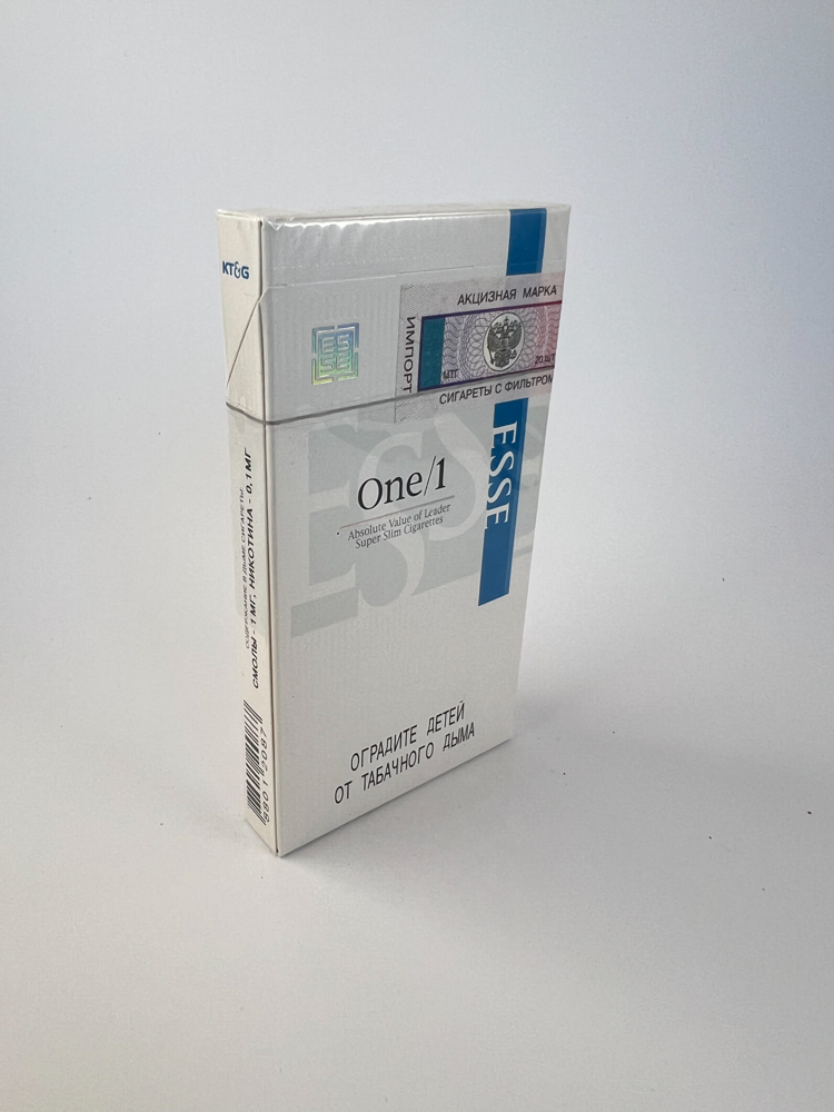 Description: This pack of ESSE One/1 cigarettes has a modern, minimalist design. The color scheme is predominantly white with subtle gray graphics and a blue vertical stripe that displays the brand. The One/1 line emphasizes the reduced tar and nicotine content, designed for consumers looking for the lightest possible option. The pack contains 20 superslim cigarettes, and a Russian import excise sticker on top indicates that the product is intended for the Russian market. The manufacturer is marked in the upper right corner - KT&G (Korea Tobacco & Ginseng Corporation).