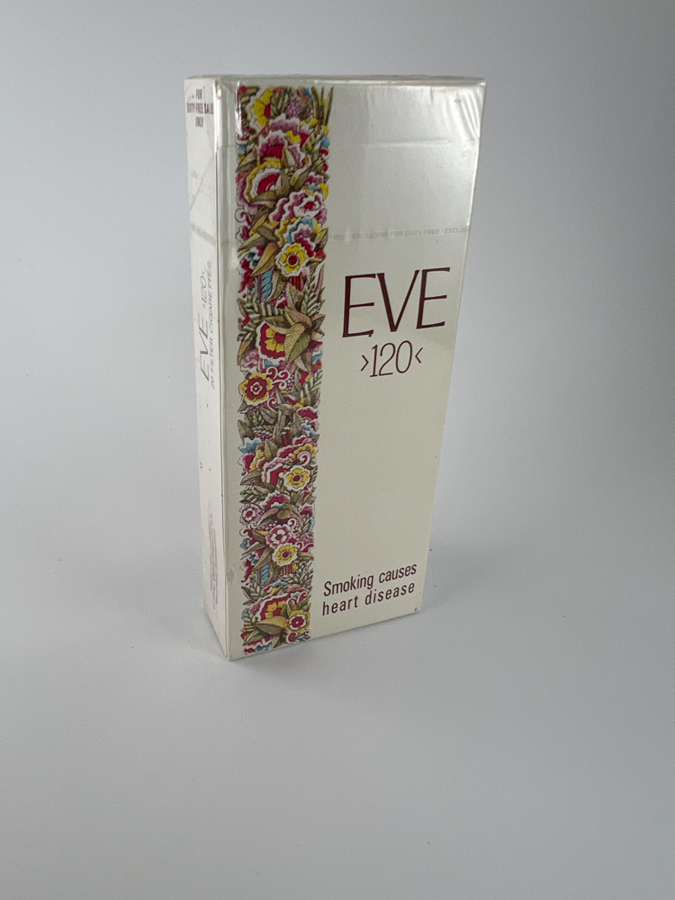The pack features an elegant light background with a delicate floral graphic on the edge, "EVE >120<" at the top, and the English warning "Smoking causes heart disease" at the bottom. There may be a designer-issued version for Duty Free.