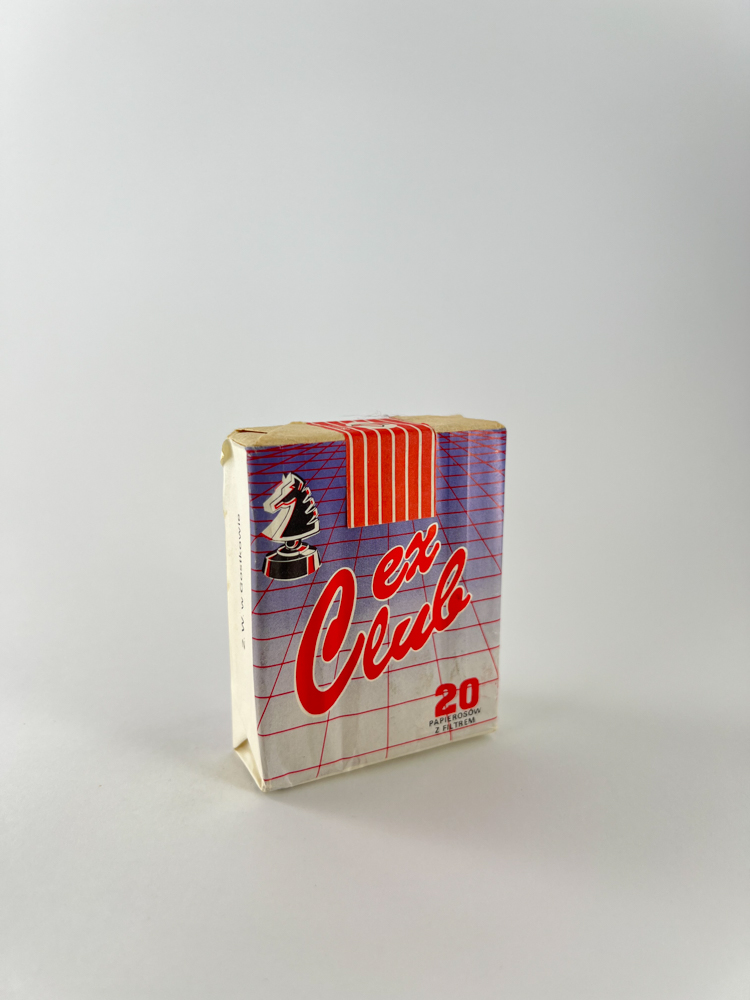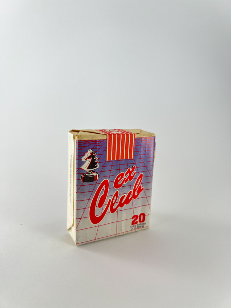 „ex Club“ – tai vienas iš mažiau žinomų, tačiau labai įdomių lenkiškų cigarečių pakelių iš ankstyvojo pokomunistinio laikotarpio. Pakelis vizualiai išsiskiria futuristiniu fonu – violetiniu tinkleliu ant perspektyvinio paviršiaus, raudonais šriftais ir šachmatų figūra (žirgu), simbolizuojančia strategiją ar išskirtinį stilių. Tokia stilistika būdinga 90-ųjų pradžiai, kai dizainas eksperimentavo tarp vakarietiško efektingumo ir vietinių įtakų. Pakuotės būklė išlikusi pakankamai gera, su autentišku akcizo ženklu viršuje.