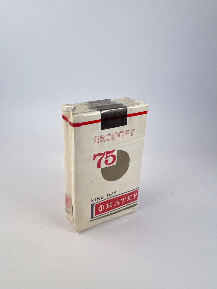 A soft pack of classic design with a minimalist composition. The dominant color is white with a horizontal red stripe at the top. In the center is the red number "75" and a golden circle, under which is written "KING SIZE FILTER". On one side is the inscription "EXPORT", on the other - the same in Russian "ЕКСПОРТ". At the bottom is a red rectangle with the inscription "FILTER / ФИЛТЕР". This is a typical Eastern European export design of the 1960s-1970s, characterized by simplicity and clear lines.