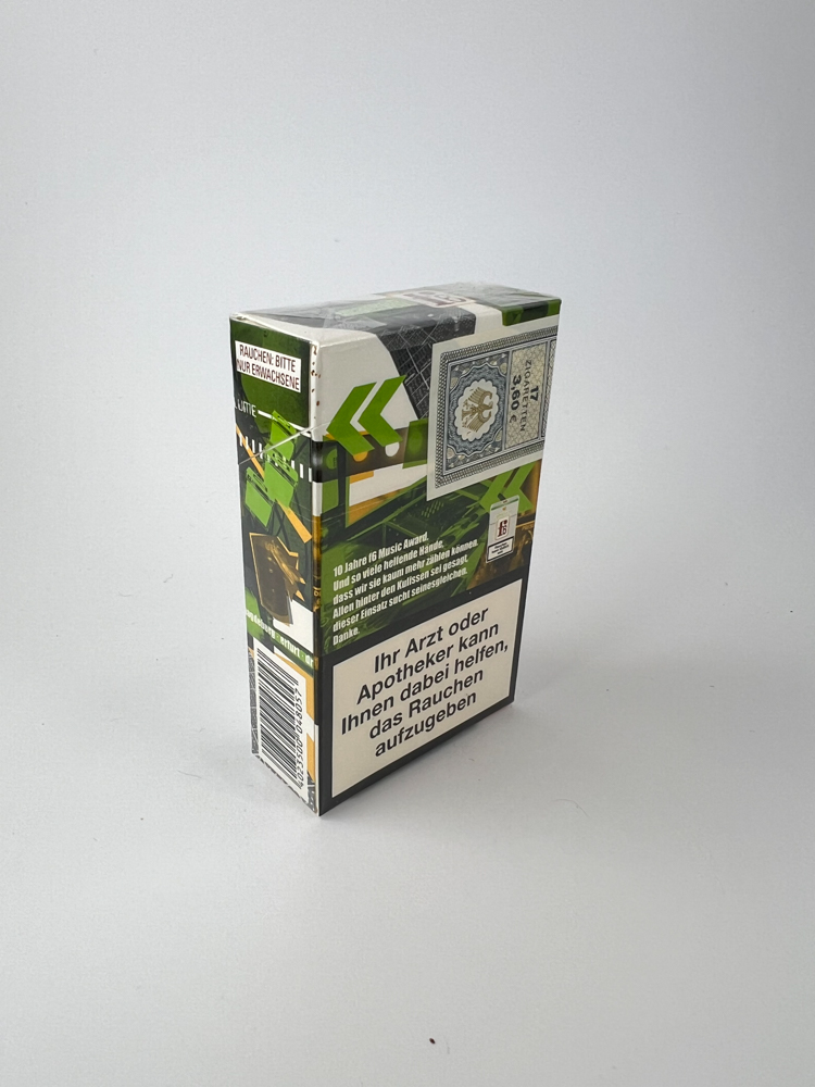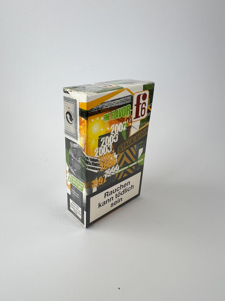 This is a limited edition f6 Fine Flavor cigarette pack, released to commemorate the 10-year history of the f6 Music Award (1999–2009). The pack is decorated with colorful concert and stage graphics, and dates from 1999 to 2009 are indicated. It also contains informational text thanking all the performers and organizers. An interesting fact is that this is one of the few cigarette packs released to commemorate the anniversary of the music awards. The side of the pack has the inscription "Rauchen bitte nur Erwachsen" (Smoking only for adults), and on the front and back are warnings about the dangers of smoking in German.