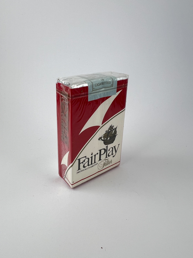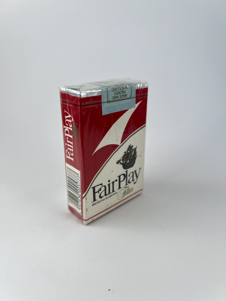 „Fair Play Filter is a classic cigarette pack, manufactured and packaged in the Netherlands. The red and white color combination, along with a stylized illustration of a sailing ship in the center, conveys the atmosphere of travel and old times. The name "Fair Play" and the inscription "Premium Cigarettes - Filter" are highlighted on the front. There is a blue excise seal sticker on top, indicating the authentic, unpacked condition. The pack is completely intact, with the factory film. The packaging of this edition does not yet have the mandatory warnings about the harm of smoking, characteristic of later EU regulations.