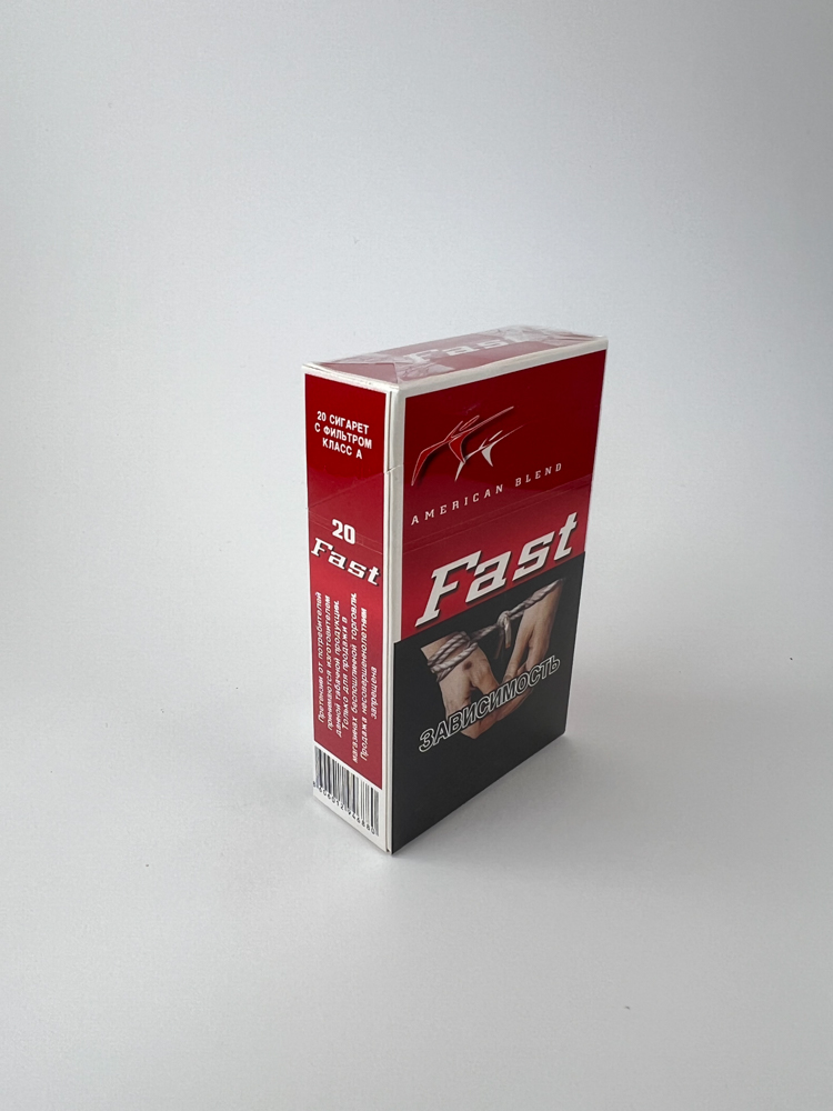 „The Fast cigarette pack features a red design with white and silver details. The top features a stylized speed symbol, with the words “American Blend„ underneath. On both sides of the pack are warnings in Russian – “Smoking Kills„ and “Addiction„ with a graphic image. The sides contain information about the classification (filtered cigarettes, class A). The pack is intended for the Russian domestic market.
