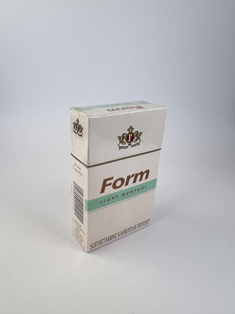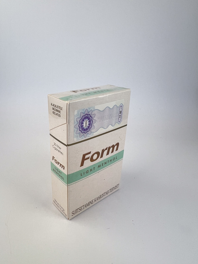 This Form Light Menthol The package has a subtle, soft aesthetic – a light background with a warm pink/brownish Form logo and a central pastel green stripe indicating the menthol flavor. A warning appears on the bottom edge of the package „"Suitsetamine damage health!"“ (in Estonian, meaning "Smoking is harmful to health"), indicating that this is a release in the Baltic region, probably Estonia. There is minimal printing on the top and sides of the package, and a figurative security element (stamp or hologram) is visible on the upper side. The cellophane is still on the package, although there are some signs of yellowing/aging. The corners are slightly rounded, but there are no obvious tears or major deformations.