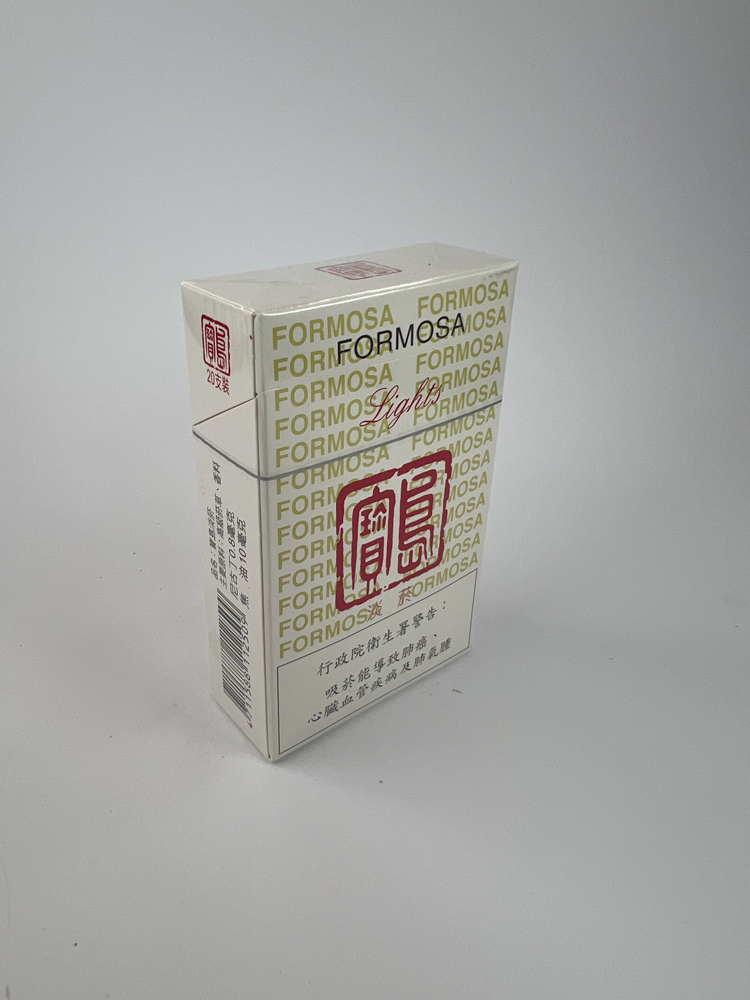 Description: Formosa Lights cigarečių pakelis yra šviesaus dizaino, pagrinde baltas su pasikartojančiu prekės ženklo užrašu „FORMOSA“ šviesiai žaliu šriftu. Pagrindinis dėmesys skiriamas centriniam raudonam kiniškam simboliui, kuris išsiskiria iš bendro fono. Viršuje matomas Taivano akcizo ženklas bei gamintojo spaudas. Įspėjimas apie rūkymo žalą pateikiamas kiniškais rašmenimis. Vizualiai pakelis perteikia švaros, paprastumo ir tvarkingo stiliaus įvaizdį, būdingą Taivano vidaus rinkai skirtai produkcijai.