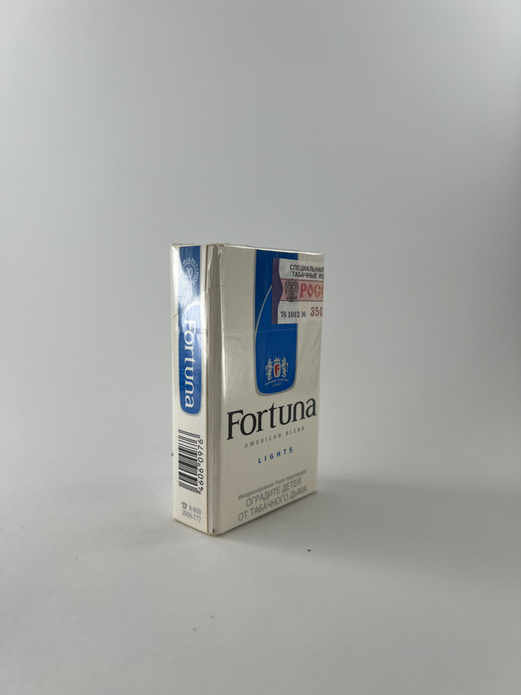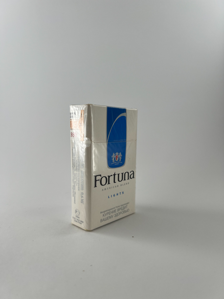 „The Fortuna Lights cigarette pack features a clean, light design with a blue panel and a classic font logo. This release is part of the American Blend line, with the "Lights" meaning a milder flavor. The top features a Russian excise stamp, confirming production for the local market. The packaging stands out for its minimalist style, which was popular at the time, to convey an image of "quality and lightness.".