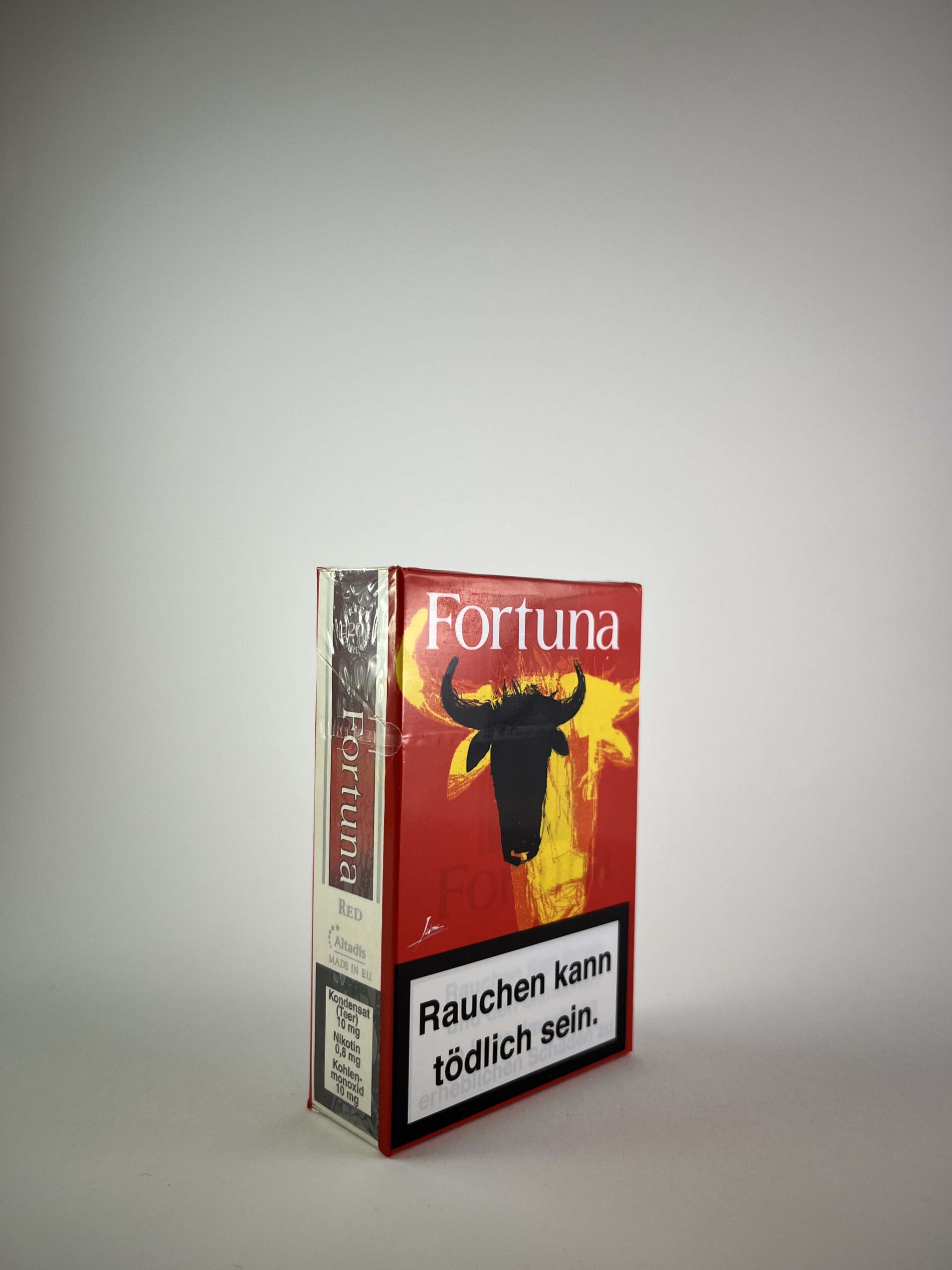 Description: This Fortuna „Red” cigarette pack stands out with its bright red background and stylish bull motif, symbolizing the Spanish brand identity. The pack design is minimalistic yet effective, with the main logo and clear, neatly arranged details. The health warnings are in German, indicating the purpose of this pack for the German market. Fortuna cigarettes are known for their traditional taste and quality.