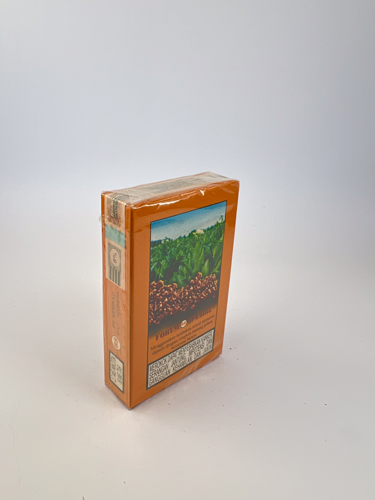 On the back side – a color photo of tobacco and clove plantations and information about the composition of tobacco and production traditions. On the left side – an excise sticker with the denomination "Rp 2000".
