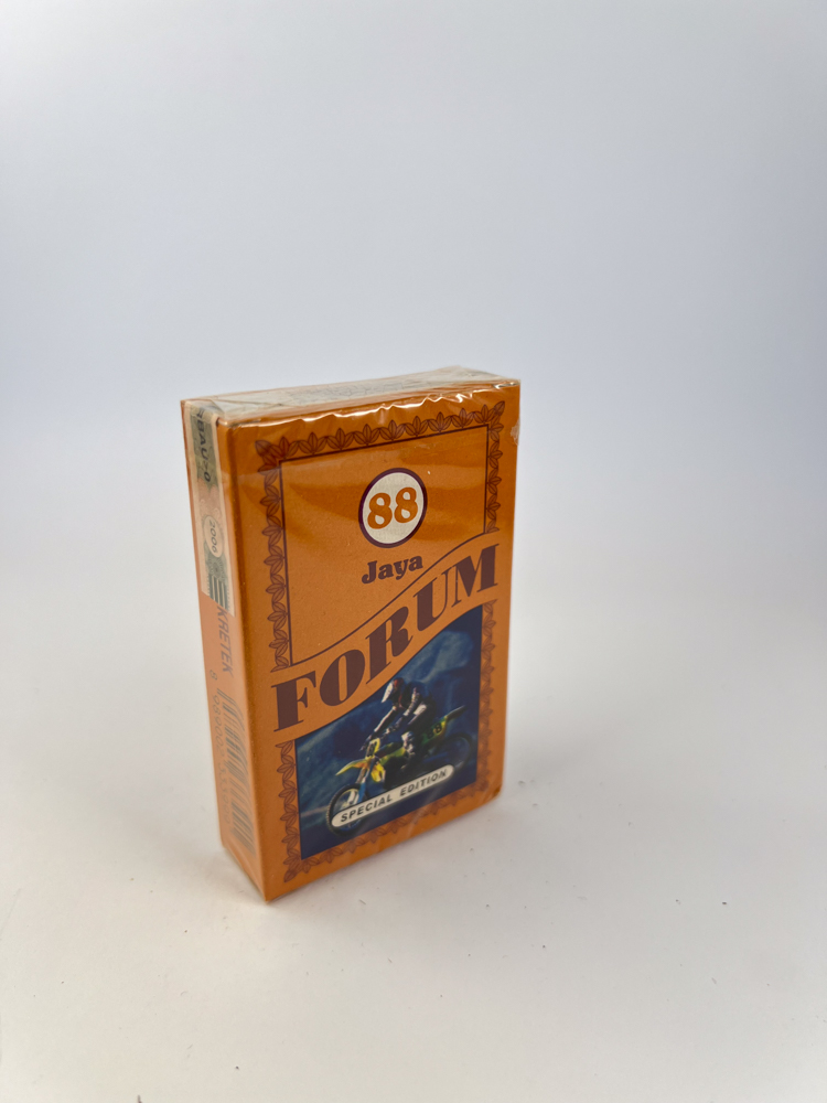 „Forum 88 Jaya Special Edition“ – tai ryškaus dizaino indonezietiškas cigarečių pakelis, išsiskiriantis oranžinės spalvos fonu ir sportiniu motyvu. Ant priekinės dalies pavaizduotas motociklininkas, po užrašu „Special Edition“, o viršuje – skaičius „88“ ir žodis „Jaya“. Pakelio šonai dekoruoti augaliniu rėmeliu, o galinėje dalyje pateiktas tabako laukų vaizdas, būdingas Indonezijos gamintojams. Pakuotė – neatidaryta, išsaugota originali celofano plėvelė, kampai tiesūs, spalvos neišblukusios. Tai modernios estetikos pakelis, kuriame juntamas vietinis dizaino identitetas.