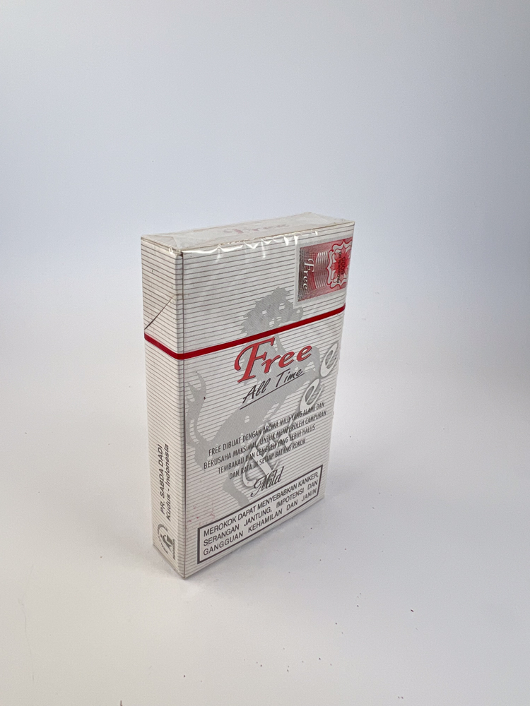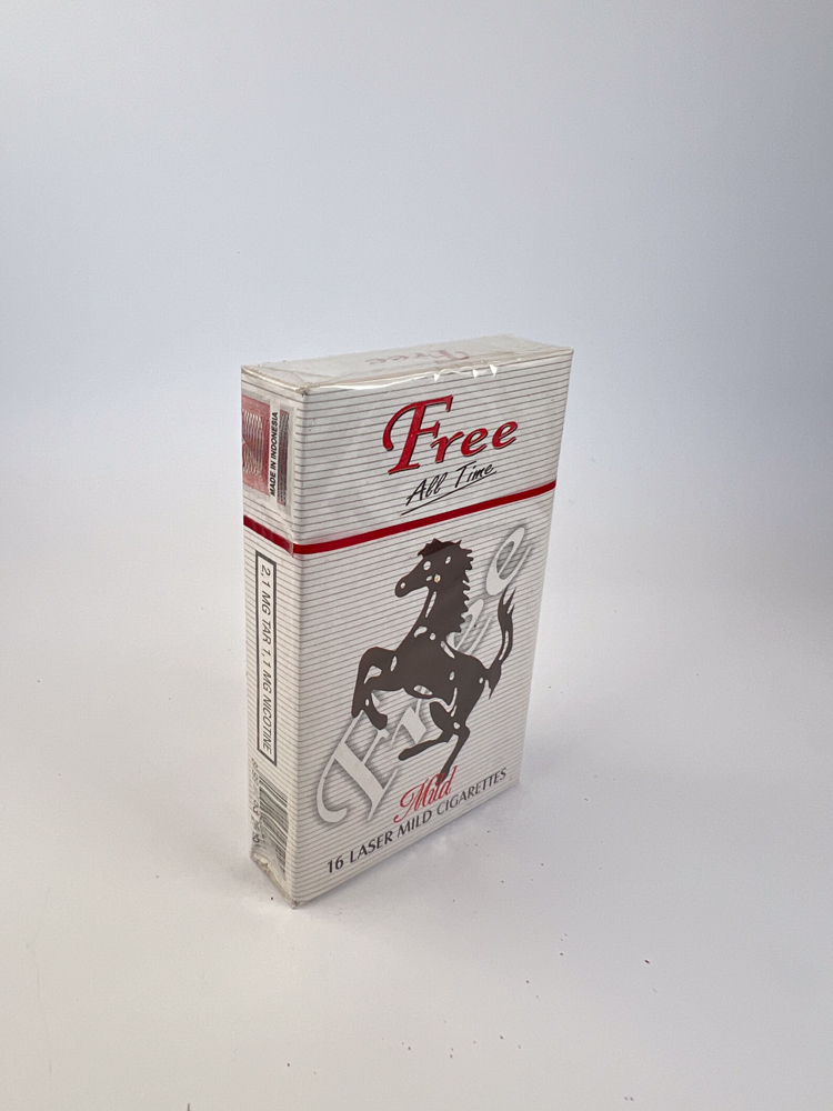 Free All Time Mild – a modern-looking Indonesian package, conveying the image of „freedom“ and lightness, popular in the Asian tobacco market of the early 2000s. The package design is minimalist – a silver background with horizontal lines, red accents and a black horse symbol, reminiscent of the sporty style of a Ferrari.