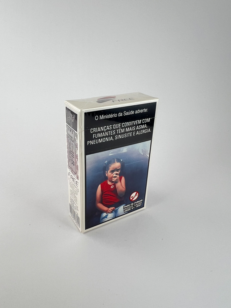 Description: This Free Box Original Choice cigarette pack features a minimalist design: a white background with the „FREE“ logo at the top, a two-color, red and dark blue stylized shape in the center. On the back is a warning from the Brazilian Ministry of Health in Portuguese, with a graphic photo of a child and the text: „Crianças que convivem com fumantes têm mais asma, pneumonia, sinusite e alergia.“. The aesthetics are balanced — a bit modern, clean, but clearly informative about the strict Brazilian laws Etsy.