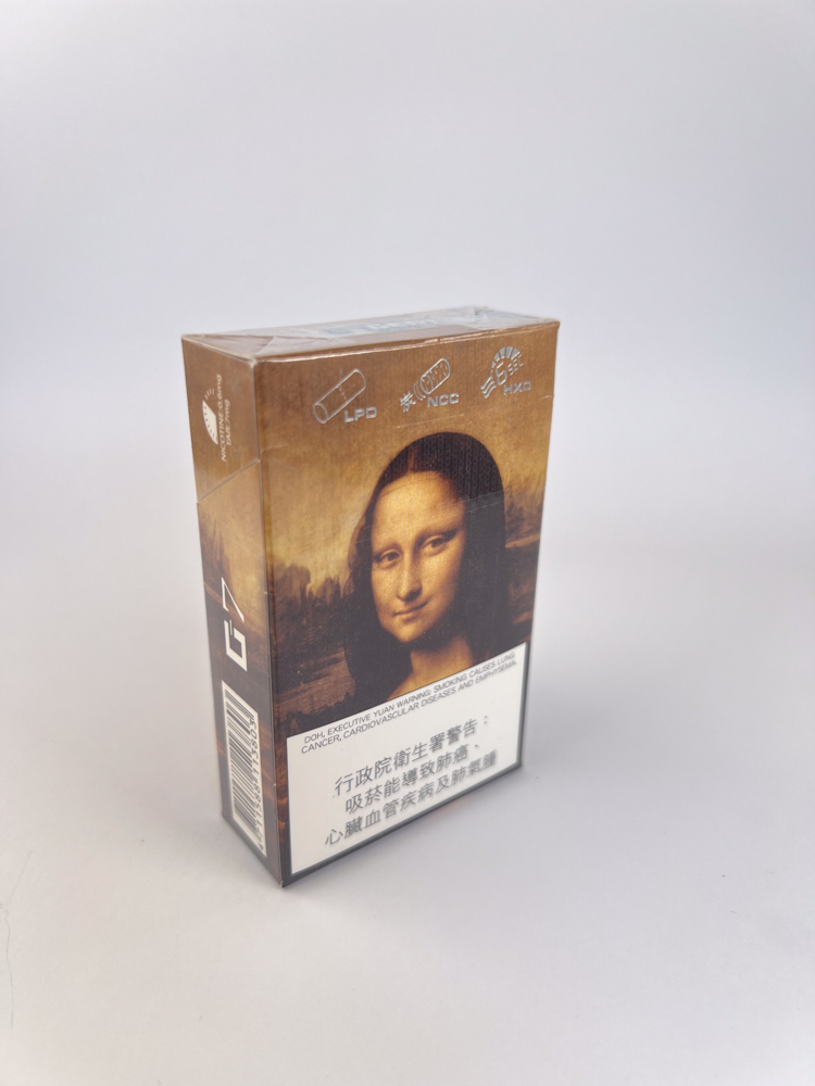It is a modern, unique design „G7 Gentle“ cigarette pack from Taiwanese. The main focus is on the famous Leonardo da Vinci's "Mona Lisa"„, occupying the entire front and back of the package. Such artistically themed cigarette packages were a rare exception even in the Asian market — they were aimed at the exclusive, young and culture-aware consumer.