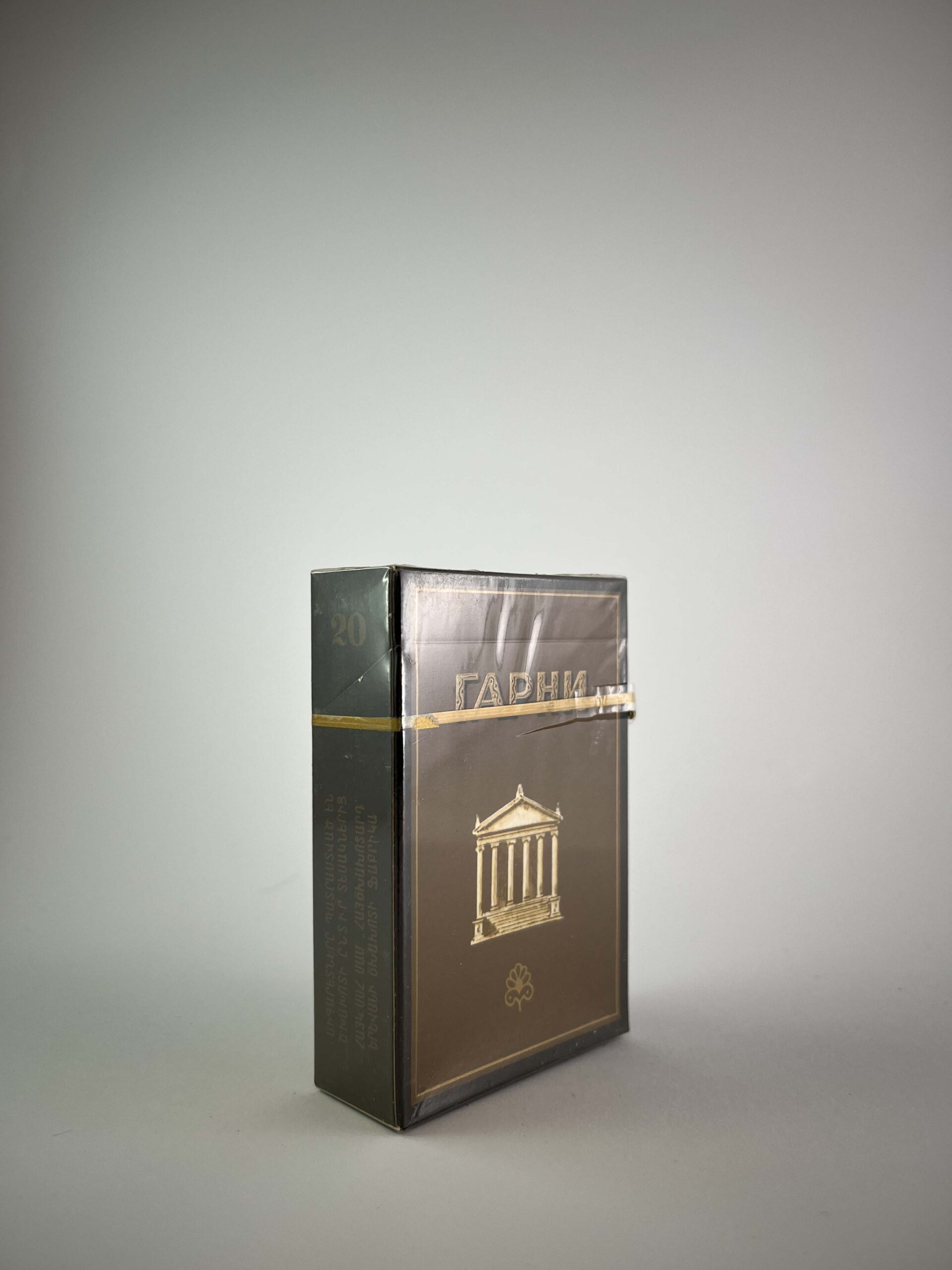 Description: The Garni cigarette pack features a solid and classic design, reflecting traditional Armenian aesthetics. A dark brown color palette with gold accents dominates, including a temple motif that may be an allusion to the Garni Temple, one of Armenia's most famous monuments. The logo and other elements are highlighted in gold, giving the pack an impression of luxury and elegance.