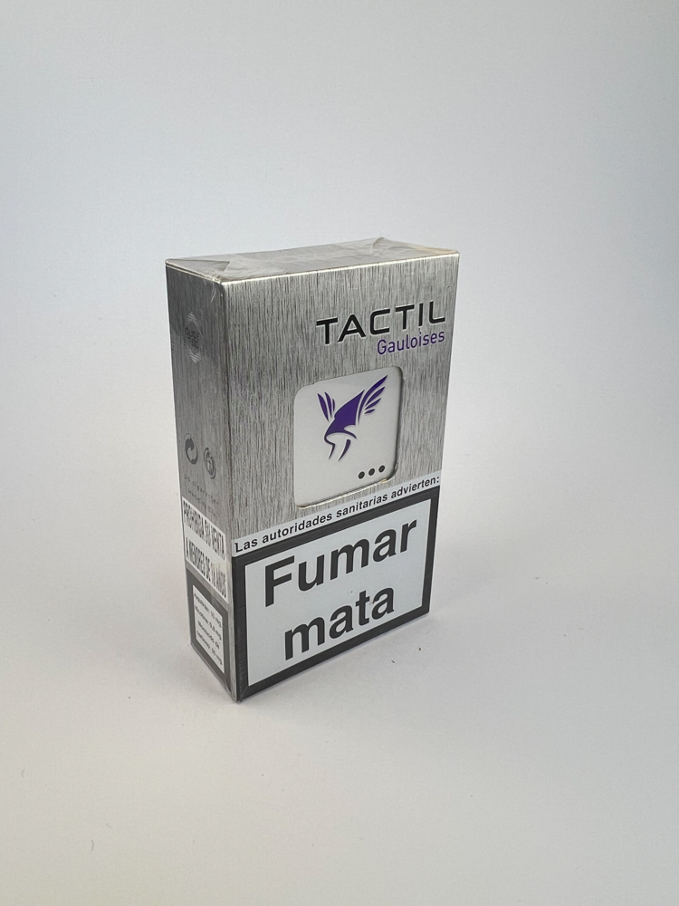 This is a modern and visually distinctive pack of Gauloises Tactil cigarettes, released for the Spanish market. The pack features a brushed metal effect design, a silver background and the purple Gauloises logo – a flying winged tip. The name „TACTIL“ emphasizes the textured surface, which is actually tactile – one of the main features of this release. The warnings about the harms of smoking are presented in Spanish, with large graphic illustrations. The pack is stamped with a Spanish excise stamp, which confirms official distribution in this country.