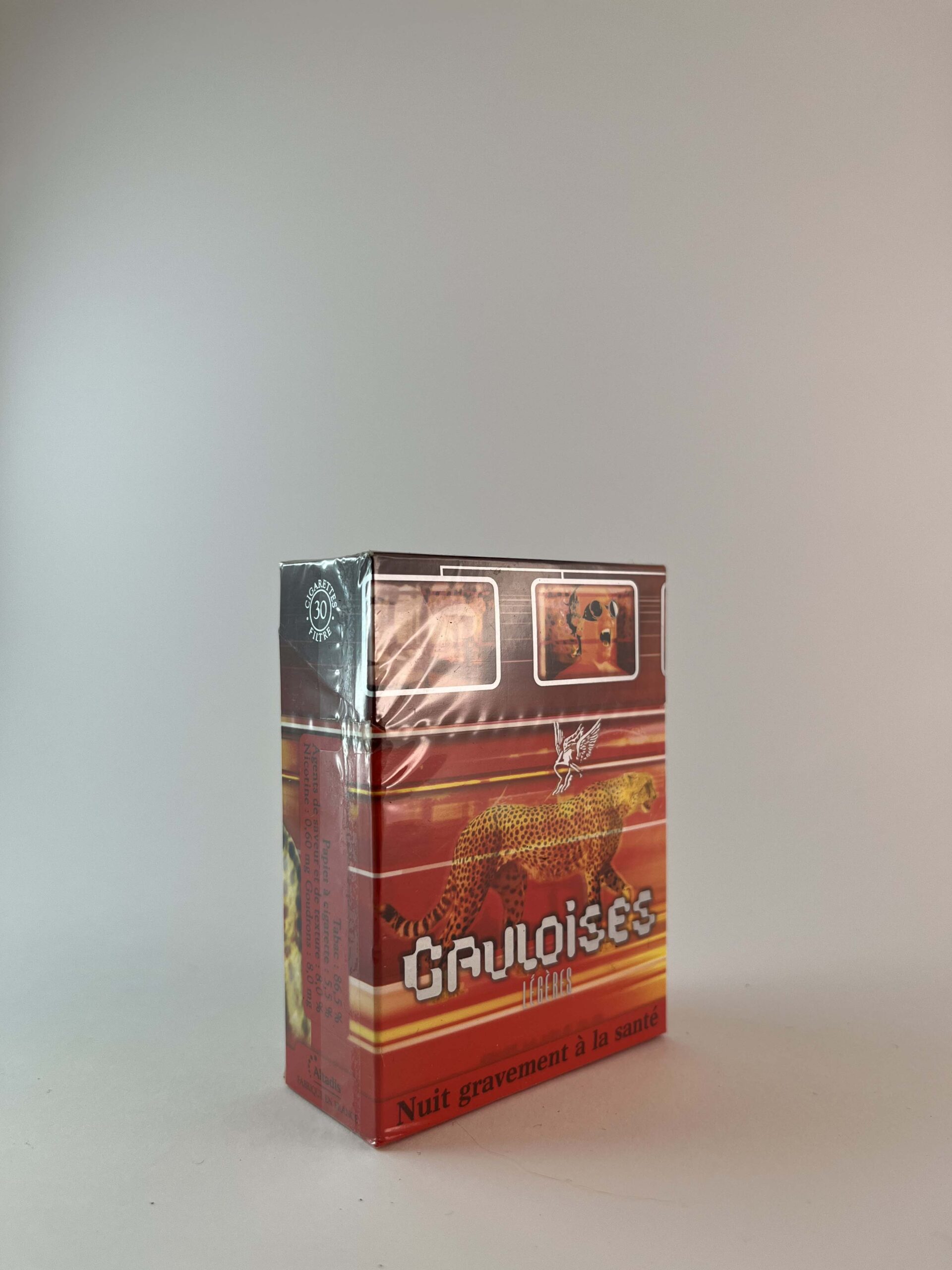 Description: Pakelis turi unikalų raudoną ir oranžinį dizainą su leopardo paveikslu. Toks dizainas yra ryškus ir lengvai atpažįstamas, sukurtas išskirtinei estetikai. Įspėjimo tekstai prancūzų kalba rodo šio pakelio rinkos geografinį skirtumą.