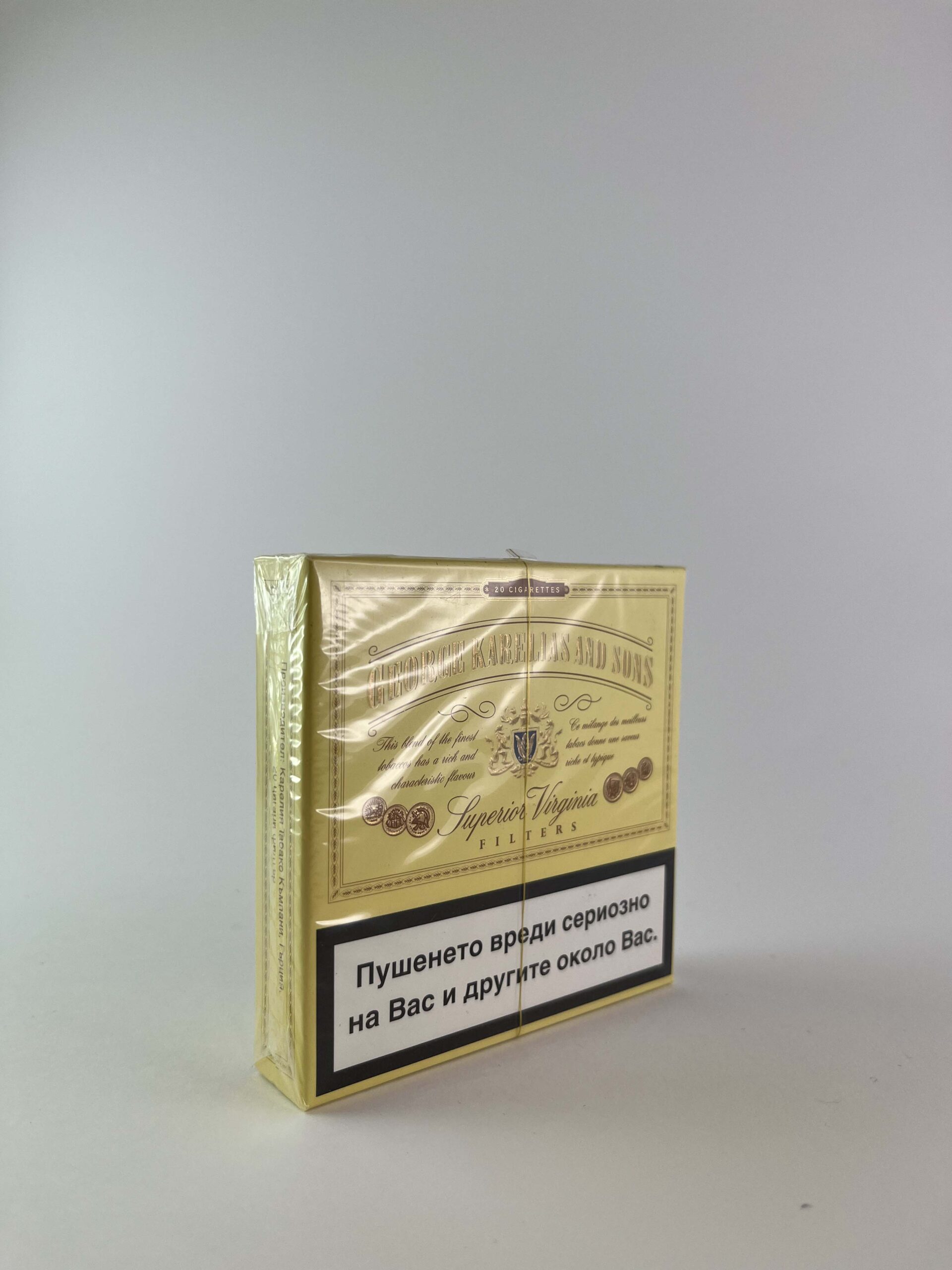 Description: This George Karelias and Sons cigarette pack features an elegant and luxurious design, with gold color and sophisticated lettering. The brand symbolizes the highest quality tobacco products, which are often associated with the Greek tobacco tradition. The packaging is in excellent condition, with a clear warning about the harms of smoking.