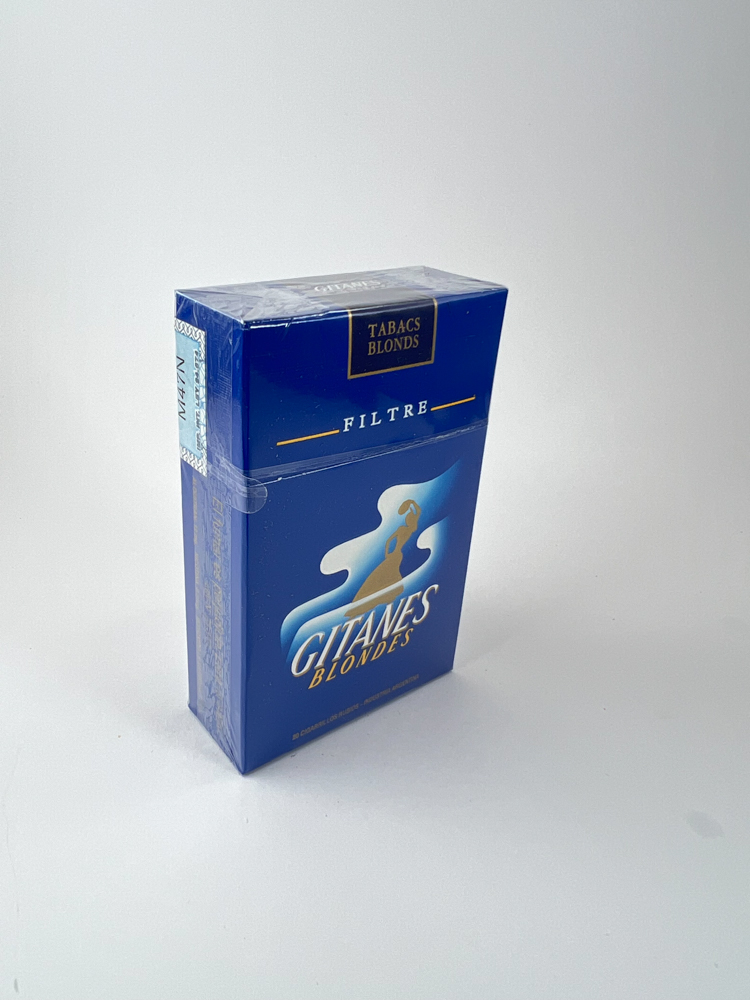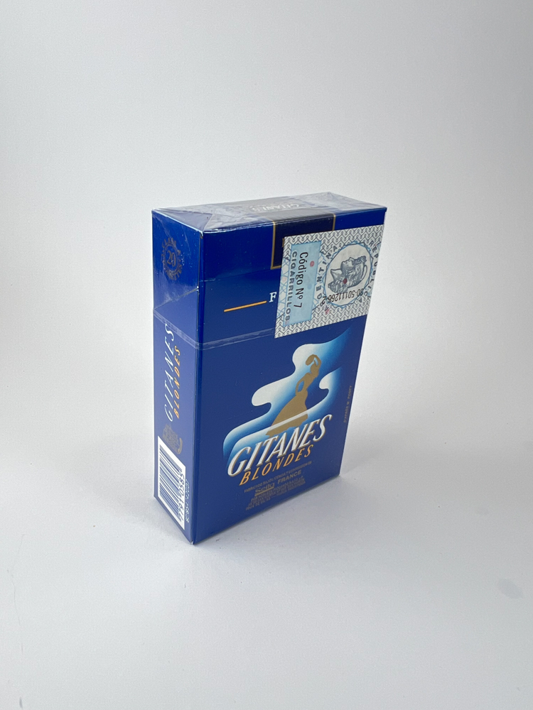 The design of the road maintains classic blue Gitanes look – blue background with a silhouette of a dancing gypsy, a smoke flow motif and gold lettering “Gypsy Blondes”. The upper part is written “"Tabacs Blonds - Filtre"”, and on the sides there is information in Spanish and production data.
