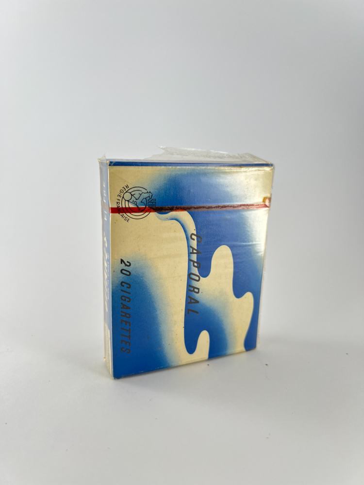 The pack perfectly reflects the aesthetics of French design of the late 20th century: a dark blue and beige color transition, with the famous silhouette figure - a dancing gypsy. The back indicates that the cigarettes are of the "caporal" type, that is, made from strong, dark tobacco. The pack also bears the "Tabac Français" marking - which emphasizes national origin.