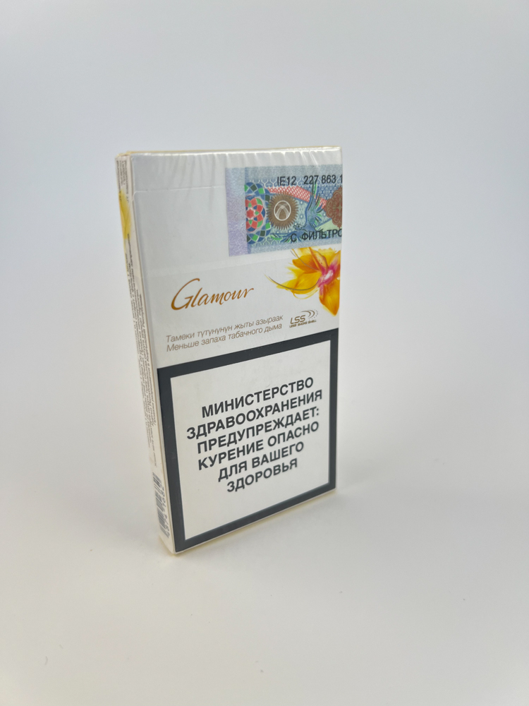 Glamour Amber Superslims is an elegantly designed cigarette pack, distinguished by a light background with a stylized flower motif and a subtle logo. The pack is intended for the Kyrgyz market, as evidenced by bilingual health warnings (in Kyrgyz and Russian) and an excise sticker with national motifs. The pack also features the „LSS“ technology, which stands for reduced tobacco smoke odor. The Superslims format indicates that these are ultra-thin cigarettes aimed at a niche consumer group.