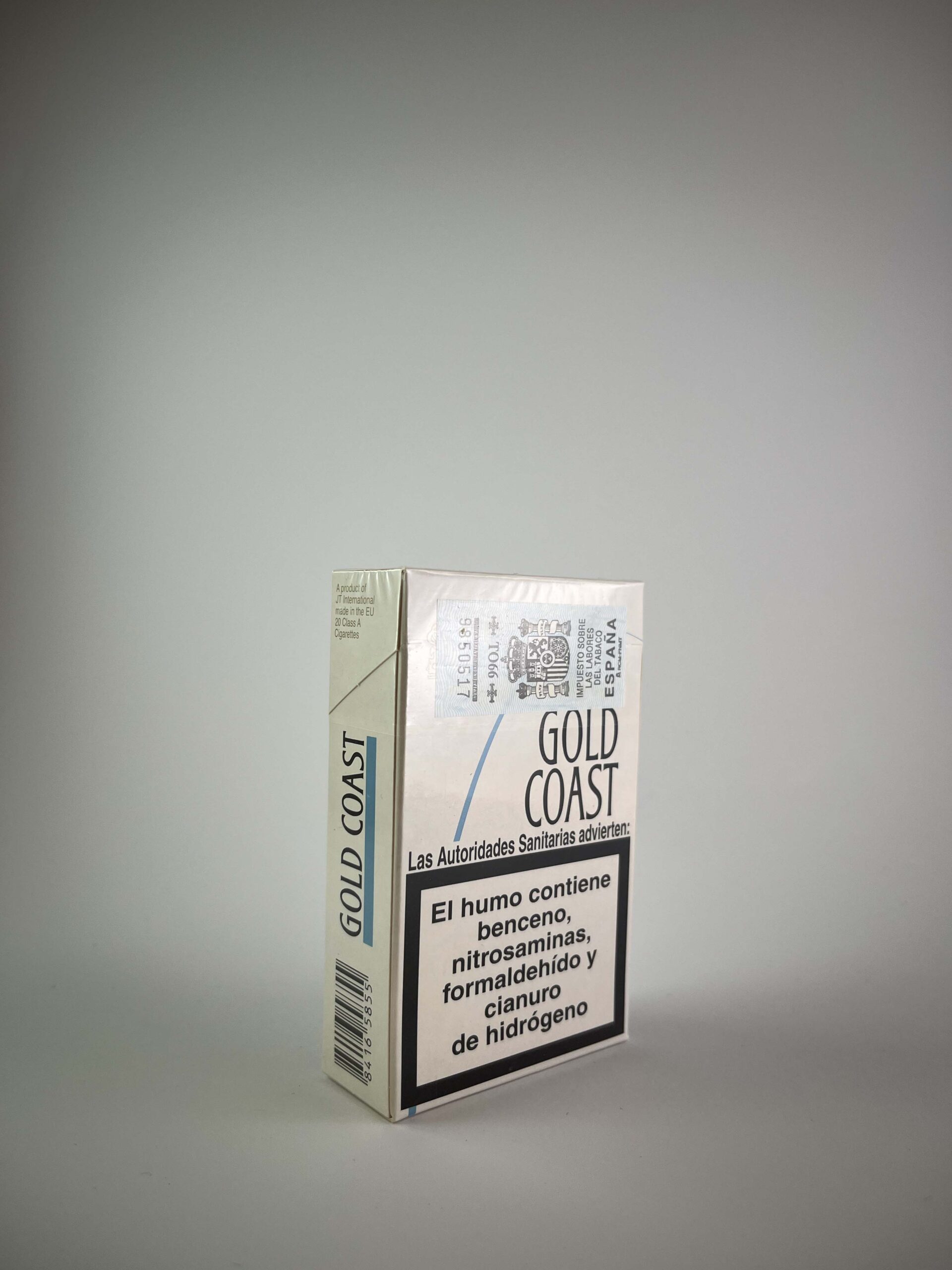 Description: The Gold Coast American Blend cigarette pack features an elegant and simple design, dominated by a white background with subtle blue accents. The name Gold Coast is written brightly and clearly on both sides of the pack. The health warnings on the pack are in Spanish, ensuring their clear visibility. This design is intended for lovers of classic and quality cigarettes, emphasizing the quality and tradition of the tobacco blend.