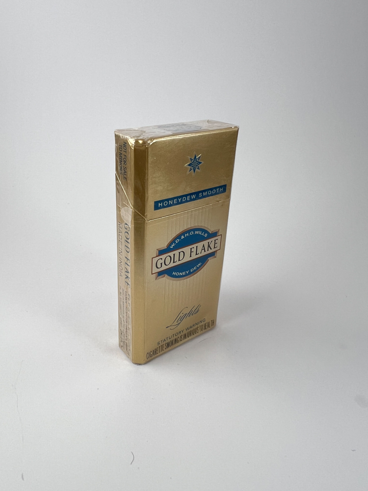 Description: This Gold Flake Honeydew Smooth Lights cigarette pack features an elegant gold design complemented by blue logos. The top part features the inscription "Honeydew Smooth", emphasizing the smooth taste. The manufacturer is listed as WD & HO Wills - one of the most historically famous Indian tobacco brands. On the sides is a note that the pack was not intended for sale (possibly a sample or limited edition). The pack is small in size - only 10 cigarettes, which gives it additional collector's value.