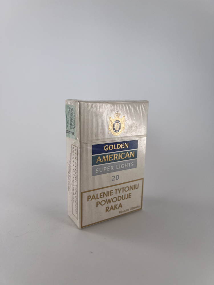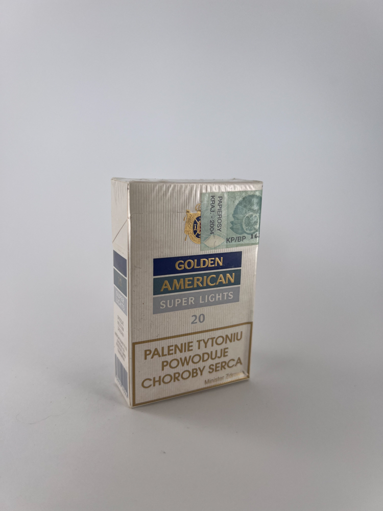 Description: „Golden American Super Lights is a light-strength version of cigarettes, created as an American-style tobacco product for the Polish market. The design is minimalist, in a classic white and blue color scheme with a gold logo and coat of arms at the top. The pack clearly states the quantity – 20 units, and the health warnings are in Polish. The excise stamp on the back shows that this pack was taxed in 2004. The hard pack is in excellent condition, the original film is intact.