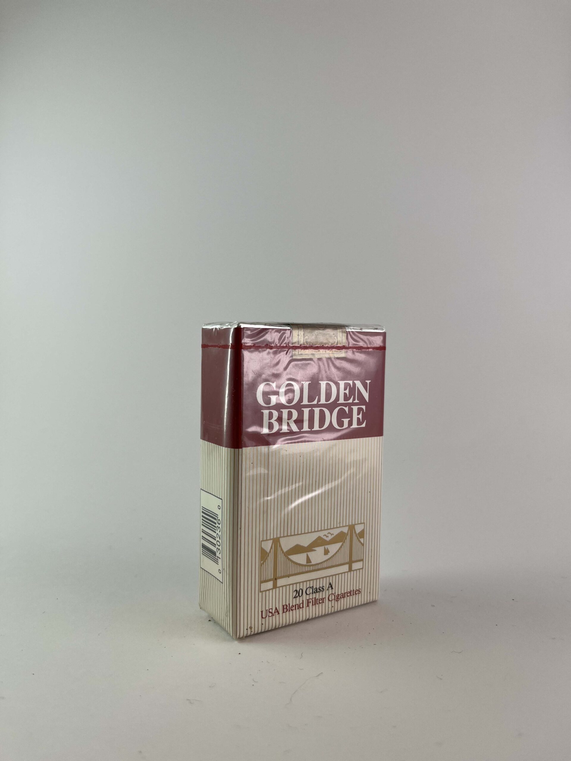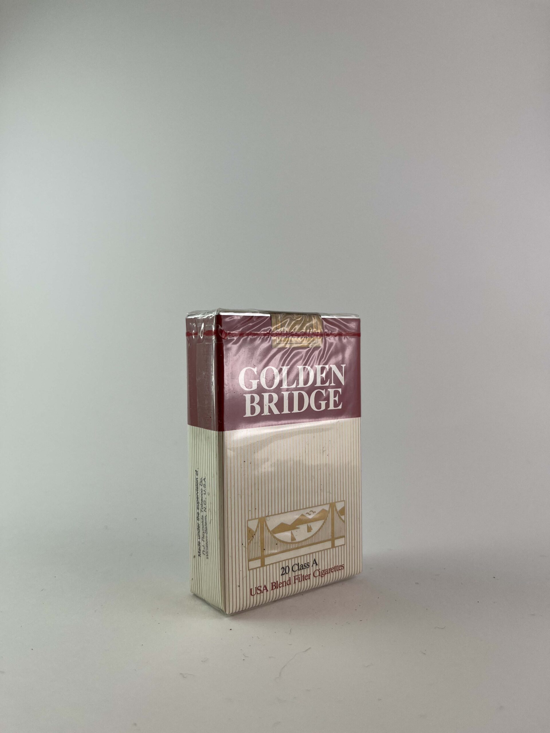 „The Golden Bridge cigarette pack features a simple and elegant design reminiscent of San Francisco's famous Golden Bridge. It is a great collector's item, reflecting the style decisions popular in US tobacco products at the time. The pack is originally sealed, therefore retaining its collector's value.