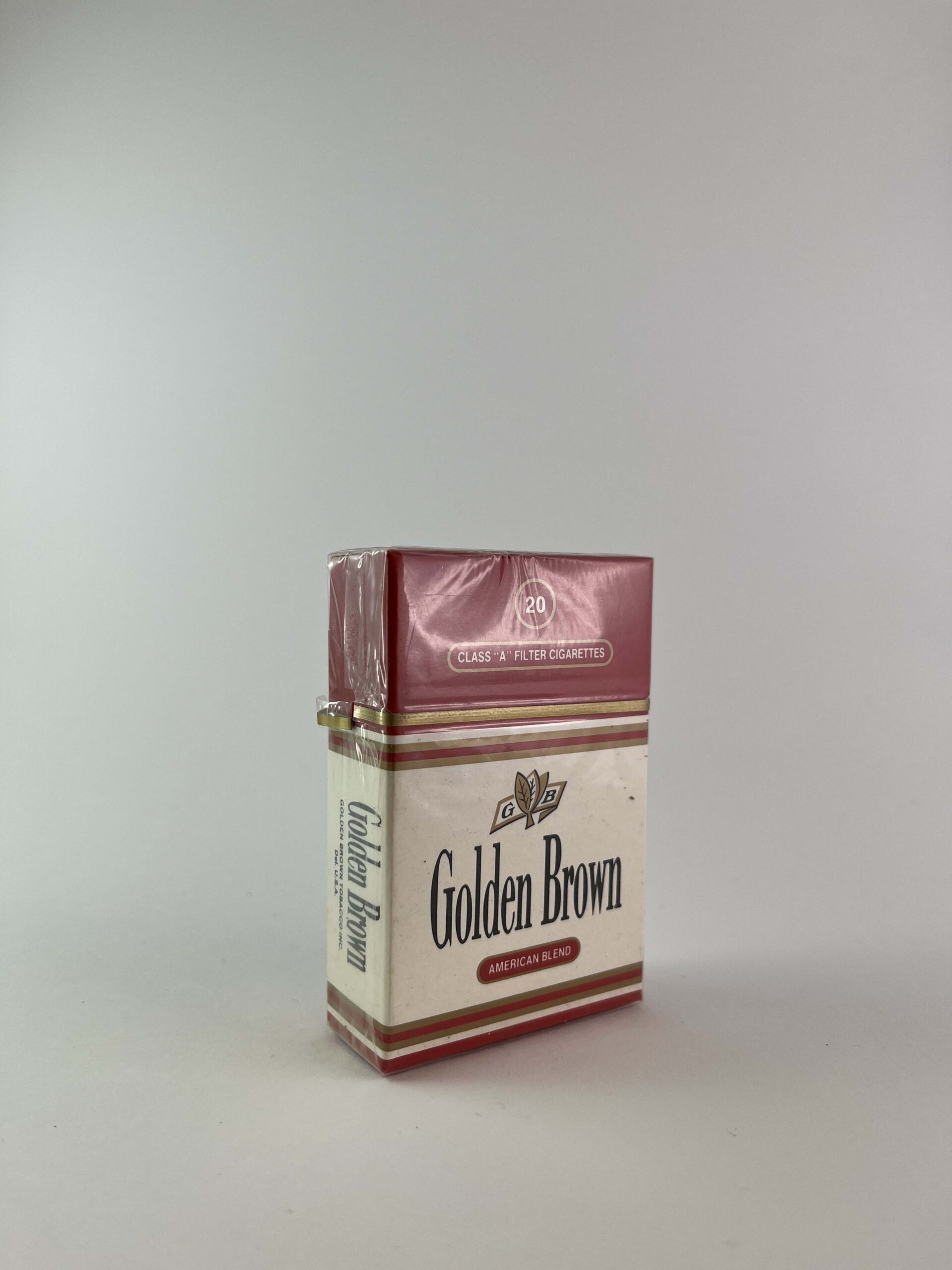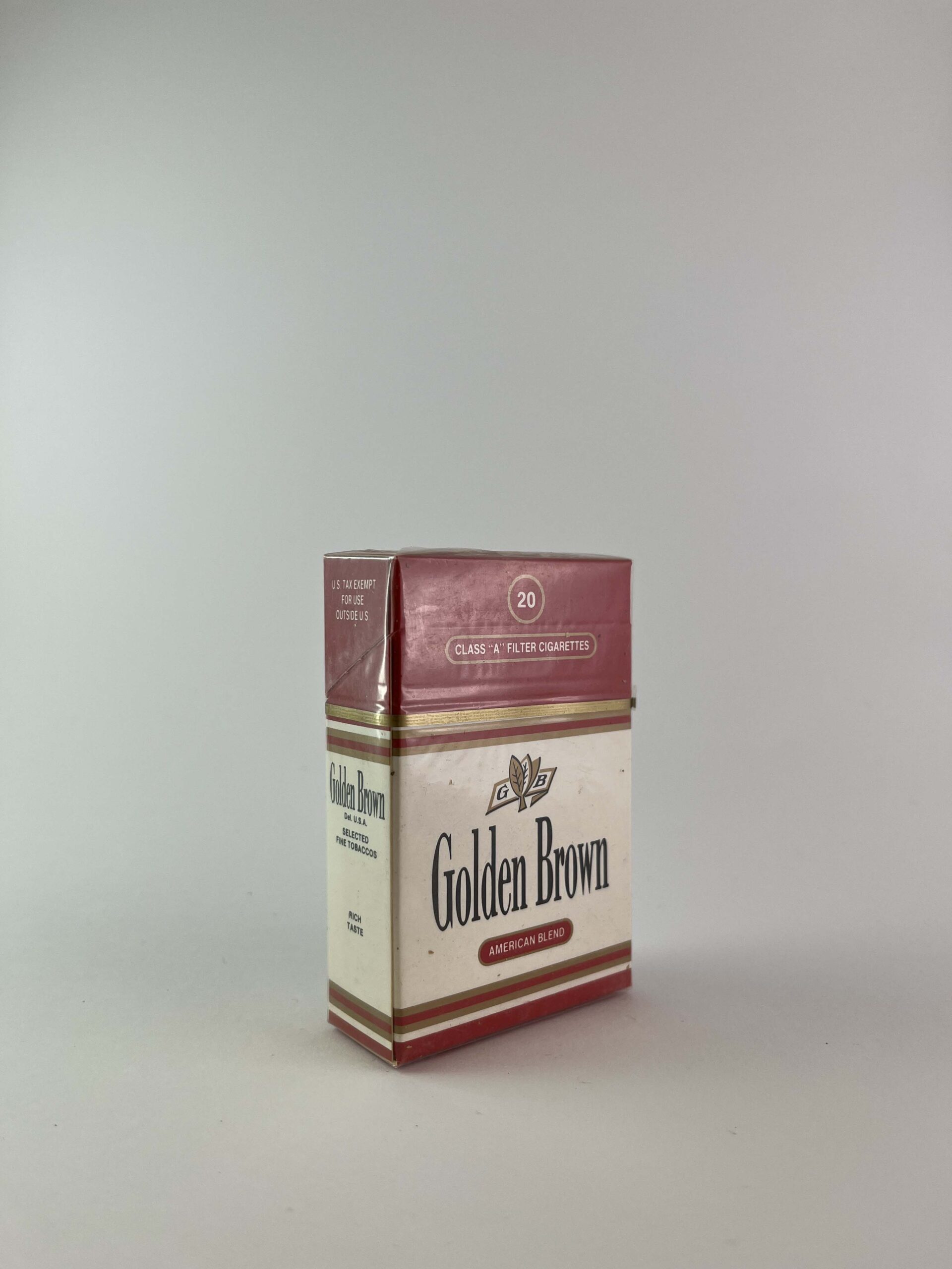 Description: This cigarette pack, called "Golden Brown," features a traditional design with a combination of red and gold, giving it a luxurious feel. The pack is intended for export, as it says "US Tax Exempt for Use Outside US," indicating that it is intended for the international market.
