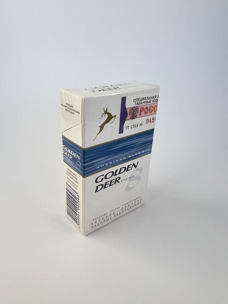 Description: „The Golden Deer cigarette pack features a modern, clean design – a white background with a blue top segment and a stylized golden silhouette of a leaping deer at the top. The number “8„ indicates the level of burning tar or nicotine (depending on the release). The inscription “American Blend„ on the package indicates the type of blend. Warnings in Russian and excise stickers indicate that the product is intended for the Russian market.