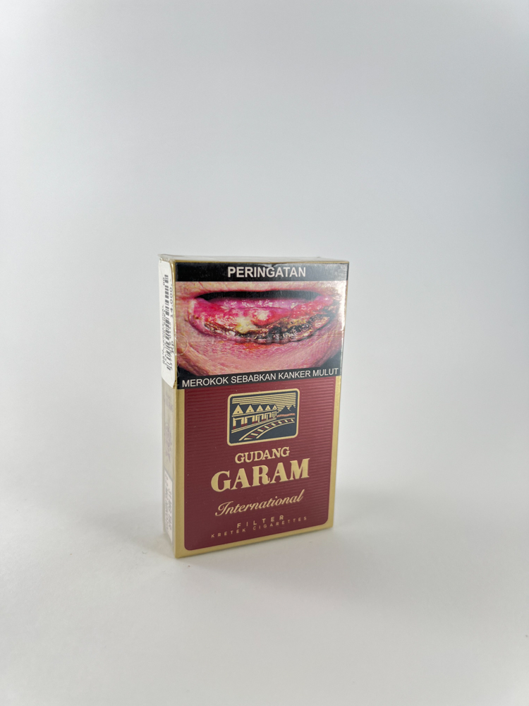 „Gudang Garam International“ yra vienas iš geriausiai žinomų kretek tipo (gvazdikėlių skonio) cigarečių produktų iš Indonezijos. Šis pakelis išsiskiria klasikinės bordo ir aukso spalvų kombinacija, kuri pabrėžia tradiciją ir kokybę. Priekinėje pusėje pateiktas ryškus įspėjimas apie rūkymo sukeliamą burnos vėžį, kuris yra privalomas Indonezijoje. Gale yra angliškas produkto aprašymas, kuris pabrėžia tabako kokybę ir paveldo svarbą. Viršuje aiškiai matomas oficialus akcizo ženklas, nurodantis legalų produktą.