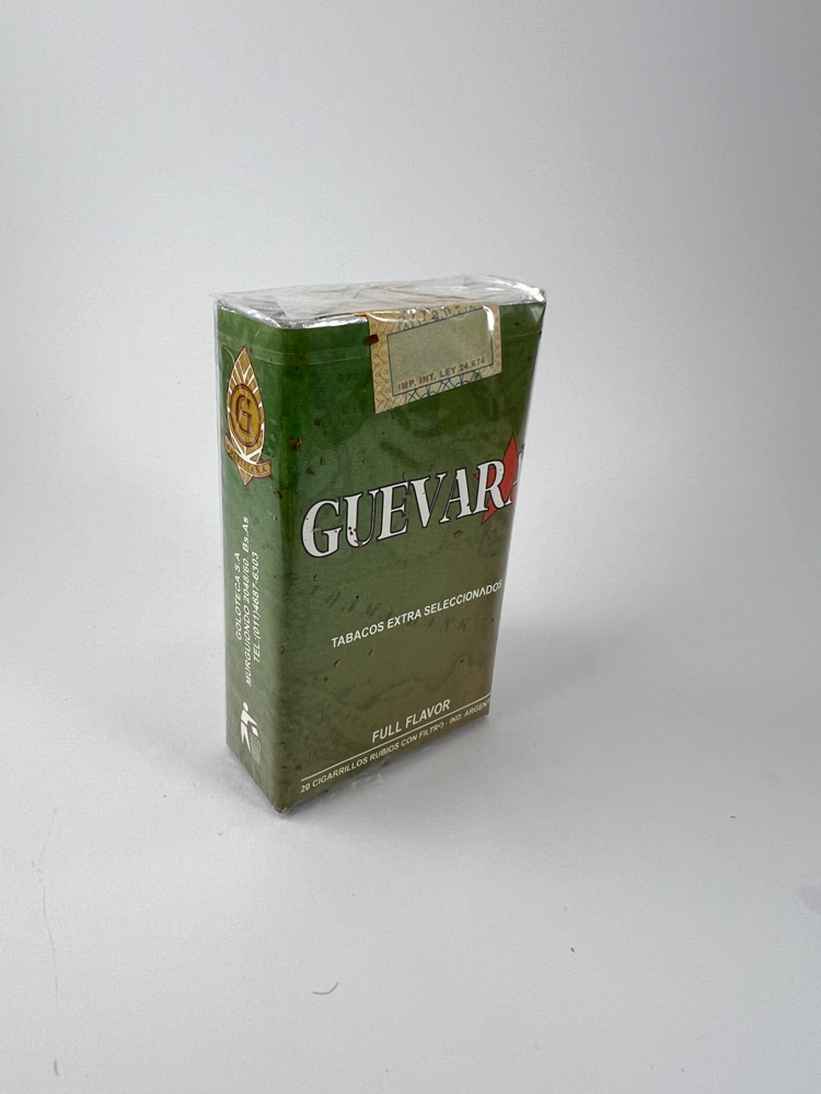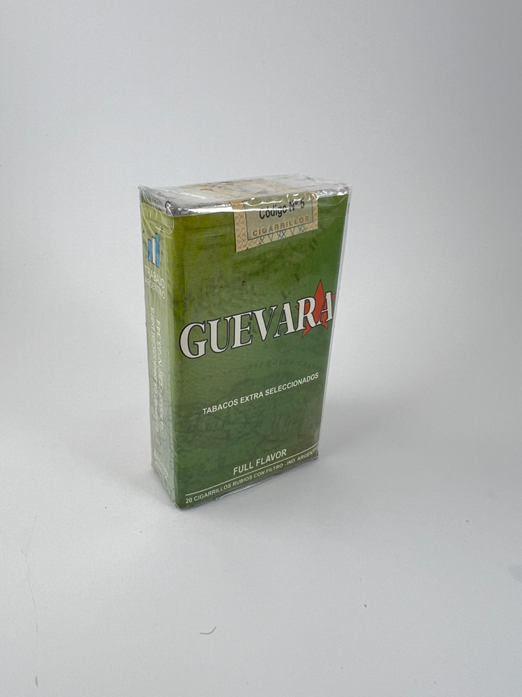 Guevara Full Flavor cigarečių pakelis vizualiai ryškus ir išskirtinis – tamsiai žalias fonas su raudonai pažymėta raide „R“ pavadinime aiškiai siejasi su revoliucinės simbolikos nuorodomis, tikėtina – į Che Guevarą. Viršutinėje dalyje yra Argentinos akcizo ženklas, šonuose pateikta informacija ispanų kalba. Pakuotėje nurodyta, kad naudojamas „tabacos extra seleccionados“, t. y. atrinktas aukštos kokybės tabakas. Šis pakelis yra originalioje plėvelėje ir puikios kolekcinės būklės.