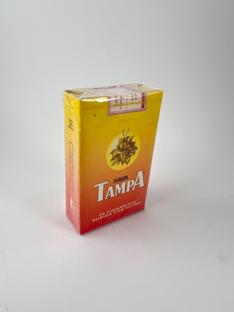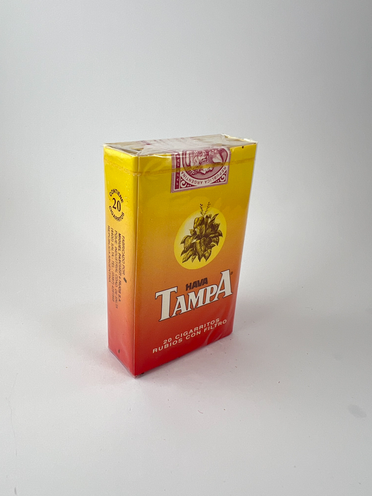 Hava Tampa – klasikinis amerikietiškos kilmės cigarilių prekės ženklas, licencijuotai gamintas Argentinoje vietinei rinkai. Pakelis išsiskiria šiltu geltonai–raudonu gradientu, primenančiu tropikų saulėlydį, su centriniu tabako lapų simboliu auksiniame apskritime. Logotipas „Hava Tampa“ pateiktas baltomis raidėmis su raudonu kontūru, o apačioje nurodyta „20 CIGARRITOS RUBIOS CON FILTRO“. Viršuje matomas originalus Argentinos akcizo lipdukas raudonos spalvos su užrašu „Republica Argentina“, skirtas cigariliams, o ne įprastiems cigarečių pakeliams.