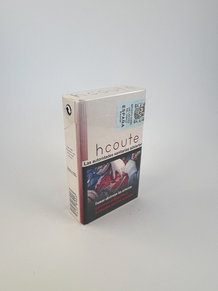 The hcoute pack has an unusual design – minimalist, stylized, with a dominant image of a woman’s eye on the front and a pastel background. It is a modern design product aimed at a niche market. The warnings about the harm of smoking are presented in Spanish, and on the back there is a graphic with a surgical scene and a phrase about vascular damage. The pack is marked with a Spanish excise stamp. The hcoute brand is unknown to the general market and is likely an experimental or limited-release product.