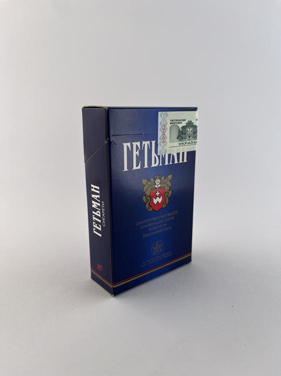 Šis „Гетьман“ cigarečių pakelis pasižymi sodria tamsiai mėlyna spalva ir heraldiniu dizainu, kuriame dominuoja herbas su skydais ir dekoratyviniais elementais. Pavadinimas „Гетьман“ (Hetman) siejamas su Ukrainos istoriniu kariniu ir politiniu titulu, todėl pakelis turi aiškų nacionalinį identitetą. Dizainas išlaikytas solidus ir reprezentacinis, būdingas aukštesnės klasės cigaretėms pereinamuoju laikotarpiu po SSRS žlugimo. Ant pakelio matomas Ukrainos akcizo ženklas, rodantis oficialią prekybą vidaus rinkoje.