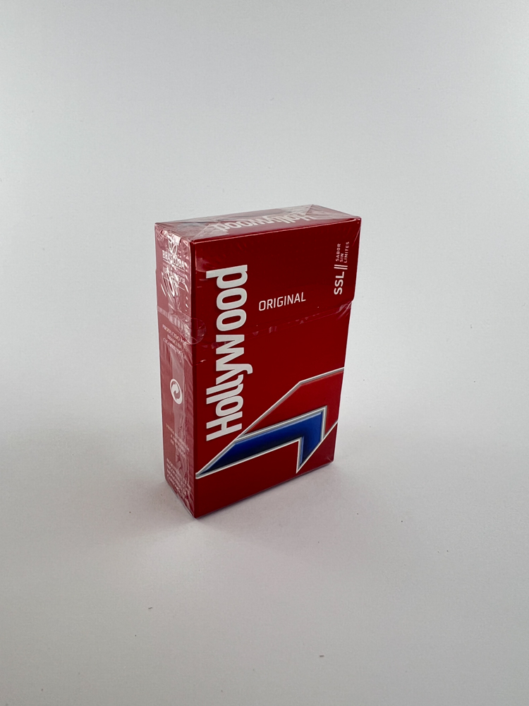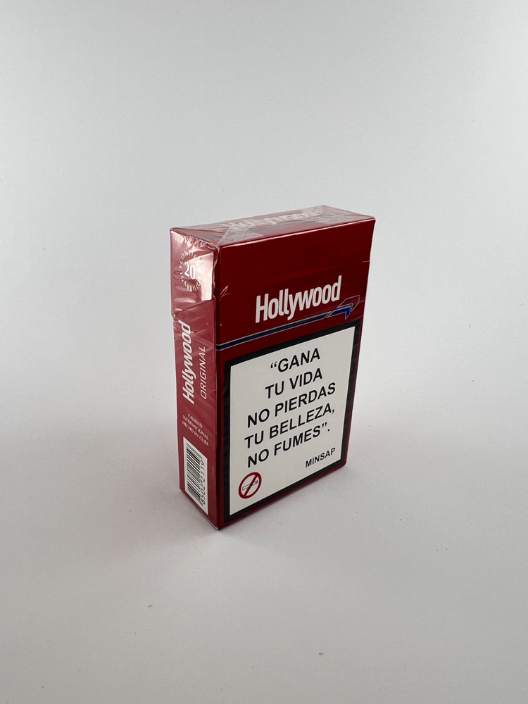 Description: „The Hollywood Original cigarette pack is bright red with a white name and a distinctive blue and silver lightning bolt motif. The back features a Spanish warning specific to the Cuban domestic market, with the Ministry of Health (MINSAP) logo. The design is reminiscent of South American tobacco products, but the specific warning suggests that this pack is intended for the Cuban market. Although the Hollywood name is known in some Latin American countries (especially Brazil), this variation is regional.