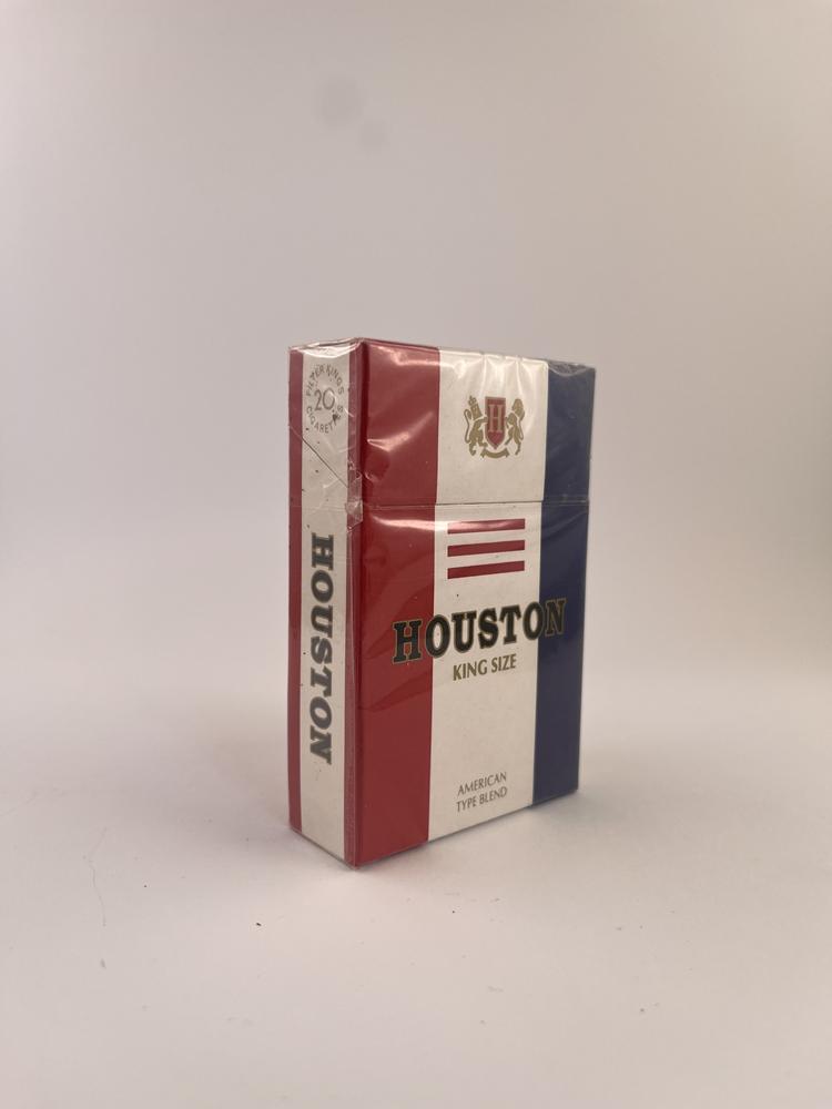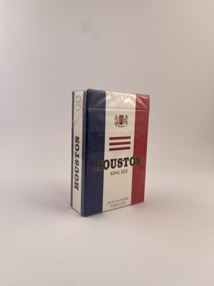 Houston “King Size” is a cigarette pack with a bright, tricolor-like design, consisting of red, white and blue vertical stripes. The name „HOUSTON“ is presented in the center and a small coat of arms above it. The design is typical of the 1990-2000 post-Soviet tobacco market brands that sought to imitate Western aesthetics. The pack is cellophane-wrapped, perfectly preserved, without printing damage or deformation. This type of regional mid-range pack from this period is becoming increasingly rare on the market today.