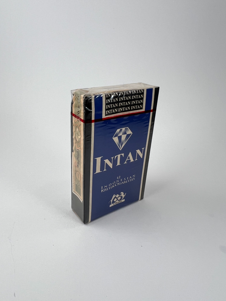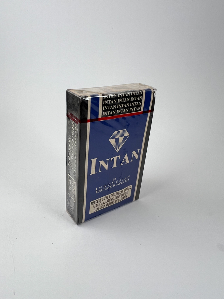 Šis „Intan“ prekės ženklo cigarečių pakelis yra išskirtinis tuo, kad jame yra tik 12 kretek tipo cigarečių – tradicinių Indonezijos gvazdikėlių cigarečių. Dizainas dominuoja mėlyna spalva su sidabriniu deimanto logotipu centre, kuris simbolizuoja patikimumą ir kokybę. Pakuotės apačioje aiškiai nurodyta „Indonesian Kretek Cigarettes“, pabrėžiant tabako gamybos regioną. Ant šonų – sveikatos įspėjimai indoneziečių kalba ir akcizo ženklas. Pakuotė neįprastai siaura, kas daro ją patrauklia kolekcininkams.
