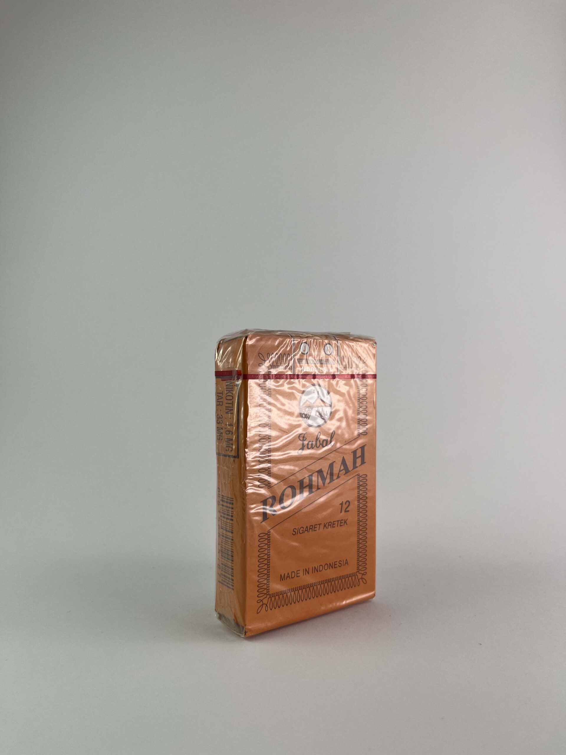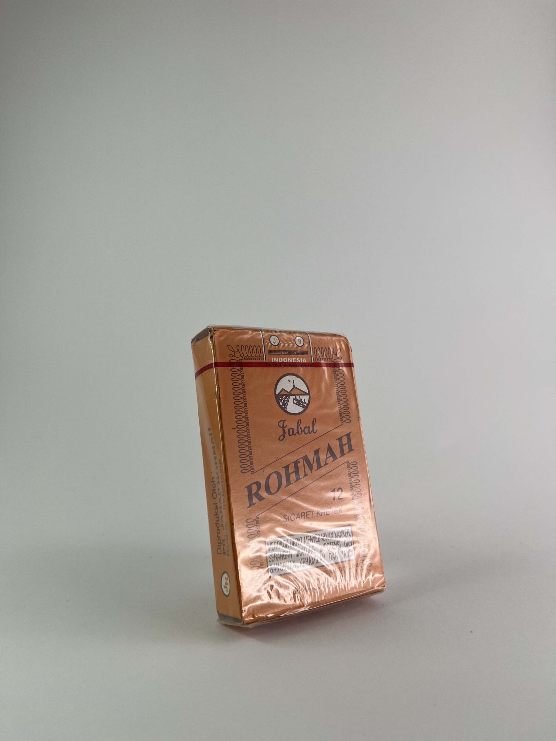 Description: This Jabal Rohmah cigarette pack features a simple yet warm design that reflects the traditional Indonesian kretek style. The orange pack with black patterns and a mountain logo creates a unique impression reminiscent of its origins. The health warning is prominently displayed at the bottom, as is typical for Indonesian tobacco products.
