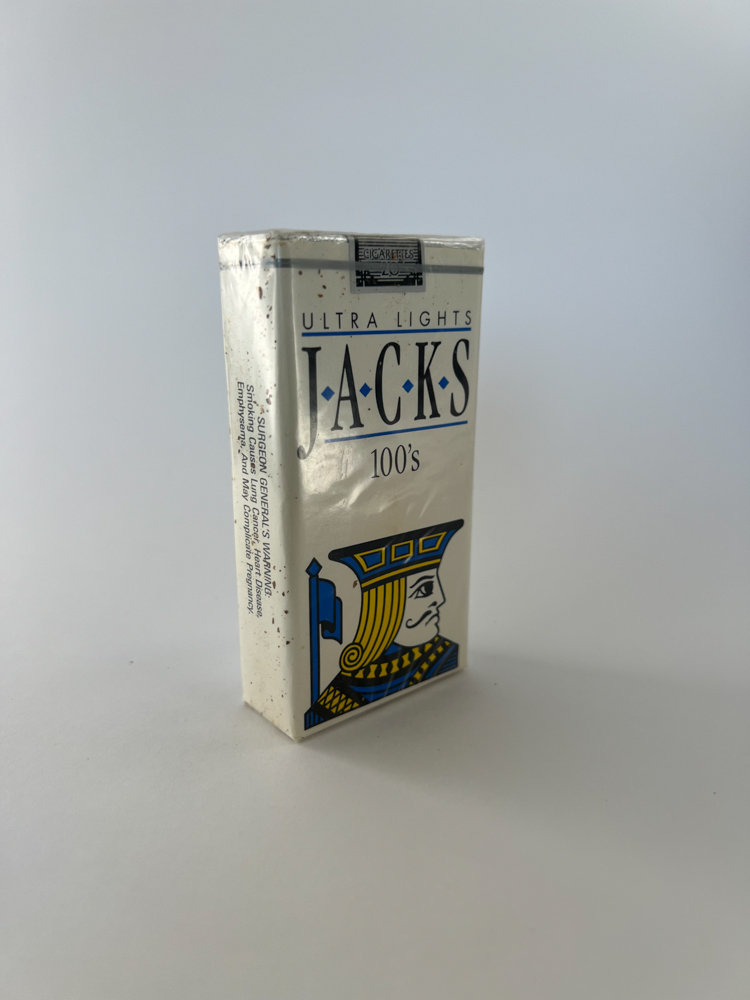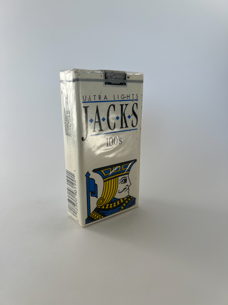 „JACKS Ultra Lights 100's is a rare US-made cigarette pack that stands out for its design, which is directly inspired by a deck of cards - the package features an image of the "Jack" figure from the playing cards. This design stood out from other, more conservative brands at the time, and was therefore aimed at younger consumers or those looking for a more playful image.