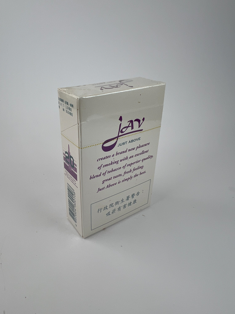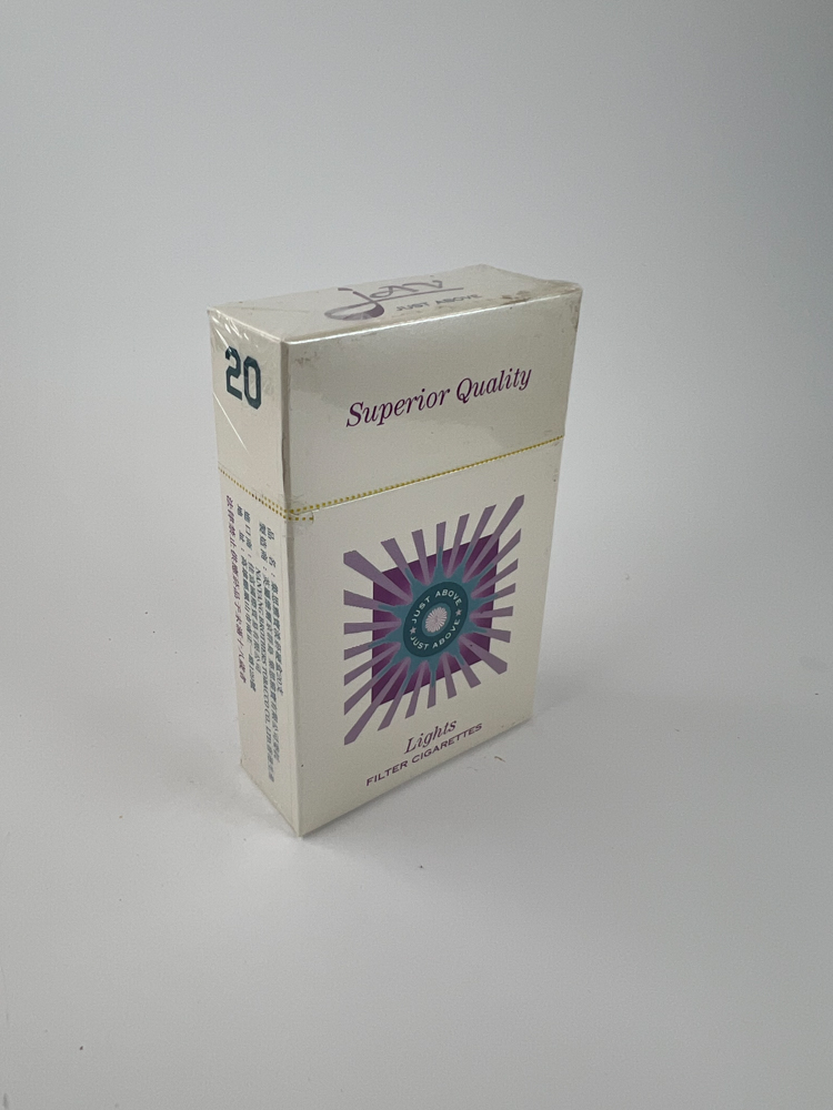 The JAS Lights "Just Above" cigarette pack features a minimalist white design with purple accents. The center features a ray ornament with the text "Just Above." The back features a distinctive slogan in English, emphasizing quality and a refreshing feel: “"Just Above is simply the best"”. Chinese text and health warning are visible on the sides and bottom. The package is originally sealed with film, and is in very good condition. The design conveys a claim of higher quality, aiming to create a premium image, typical of some products in the Hong Kong domestic market.